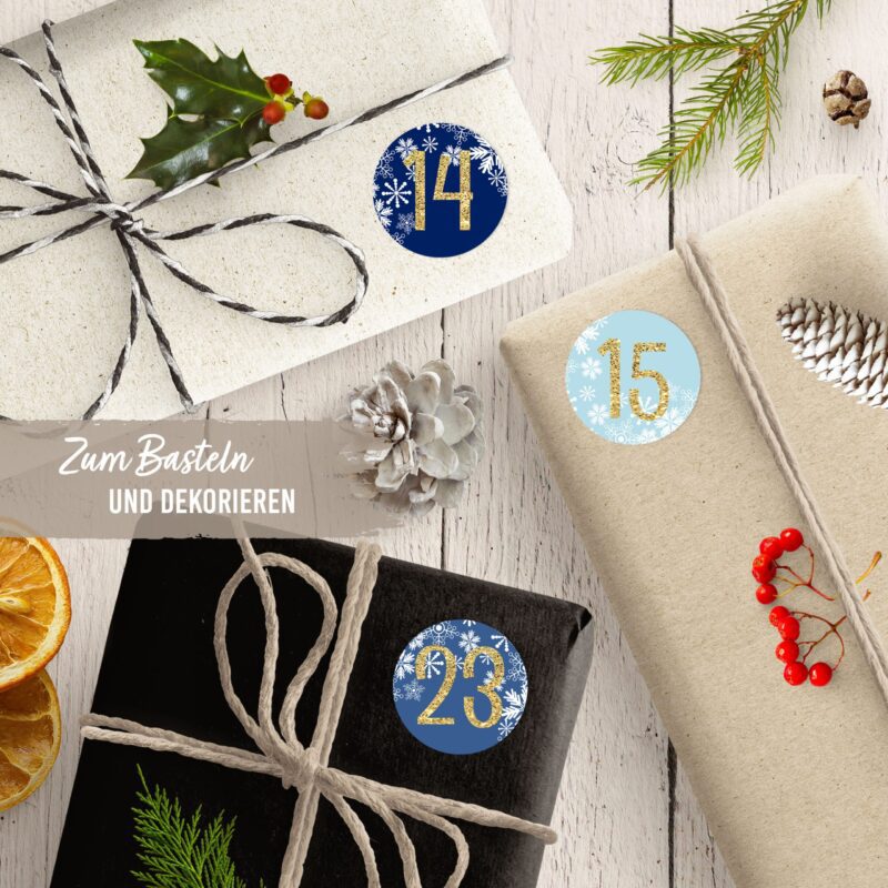 Die selbstklebenden Aufkleber (4 cm Durchmesser) lassen sich mühelos auf Geschenke, Päckchen, Stoffsäckchen, Geschenkanhänger, Geschenkboxen oder Briefumschläge kleben. So wird jeder Adventskalender individuell und besonders.