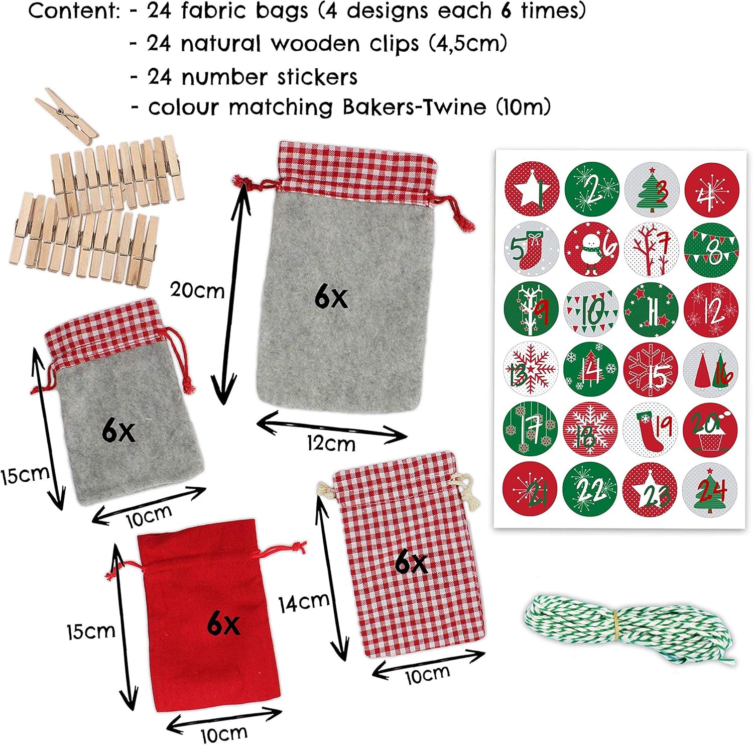 Der Adventskalender besteht aus 24 Säckchen, die im Landhausstil gehalten sind. Die Stoffsäckchen sind in stilvollen Grau - und Blautönen gehalten und werden mit den beiliegenden Zahlenaufklebern nummeriert. Anschließend können sie einfach mit Garn und Wäscheklammern aufgehängt und nach eigenen Wünschen dekoriert werden. Der Materialmix aus Baumwolle und Filz zaubert ein schönes Landhaus-Flair. 6 der Beutel sind etwas größer und können somit für besondere Geschenke genutzt werden. Dieser schicke Adventskalender wird garantiert zu einem echten Hingucker. Befüllt werden kann er nach Deinen Vorstellungen und Wünschen. Hier sind Deiner Kreativität keine Grenzen gesetzt.