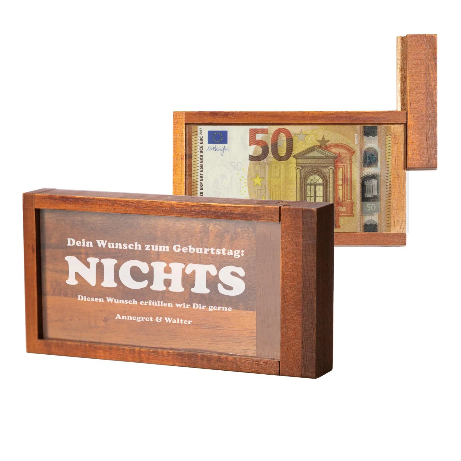 „Ich wünsche mir nichts“ – Wie oft haben wir das schon gehört uns sind beinahe wahnsinnig geworden! Wie viel Zeit und Mühe mussten wir aufbringen, um deshalb allein nach einem passenden Geschenk zu suchen? Und wie oft haben wir es gefunden? Mit diesem Aufwand ist jetzt Schluss. Von nun an nimmst Du den Beschenkten beim Wort! Was ist dieses Nichts? Wo kann man es kaufen? Was willst Du damit? Wir haben die Antwort! Das Nichts besteht aus Holz und in ihm kann man sein Geldgeschenk auf originelle Art und Weise platzieren. Das Nichts lässt sich nicht so einfach, sondern nur mit einem ganz bestimmten Trick öffnen und mit einem Wunschtext personalisieren. Du bist auf der Suche nach einem kreativen Geschenk für jemanden, der sich „Nichts“ wünscht? Hiermit hast Du es gefunden!