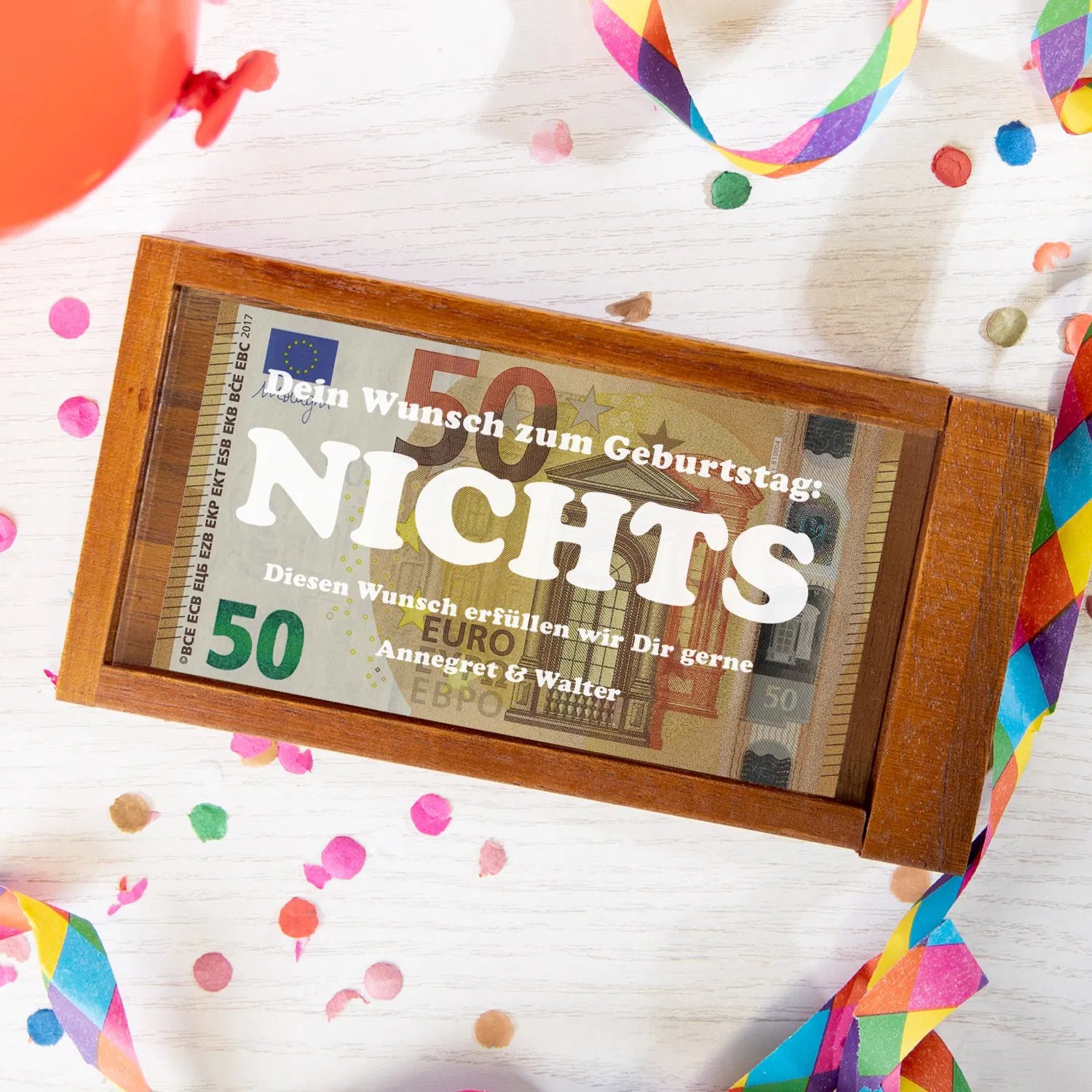 - Nichts als Aufdruck: Wir bedrucken Deine Geldgeschenkebox mit einem humorvollen Text „Dein Wunsch zum Geburtstag: Nichts“