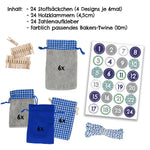 Der Adventskalender besteht aus 24 Säckchen, die im Landhausstil gehalten sind. Die Stoffsäckchen sind in stilvollen Grau - und Blautönen gehalten und werden mit den beiliegenden Zahlenaufklebern nummeriert. Anschließend können sie einfach mit Garn und Wäscheklammern aufgehängt und nach eigenen Wünschen dekoriert werden. Der Materialmix aus Baumwolle und Filz zaubert ein schönes Landhaus-Flair. 6 der Beutel sind etwas größer und können somit für besondere Geschenke genutzt werden. Dieser schicke Adventskalender wird garantiert zu einem echten Hingucker. Befüllt werden kann er nach Deinen Vorstellungen und Wünschen. Hier sind Deiner Kreativität keine Grenzen gesetzt.