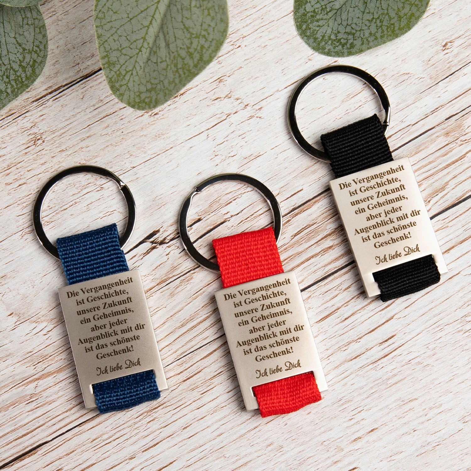 Du kannst diesen zauberhaften Schlüsselanhänger zusätzlich auf der Rückseite mit Deinen eigenen lieben Worten gravieren lassen. Füge noch einen persönliche Wunschtext hinzu und mache Deine Liebste oder Deinen Liebsten glücklich. Einmal sind die Wörter "Zukunft, Augenblick, schönste, Ich liebe Dich" in kursiver Gravur hervorgehoben. Bei der Farbe des Textilbandes hast Du ebenfalls die Wahl: Bestelle ein rotes, blaues oder schwarzes Band.