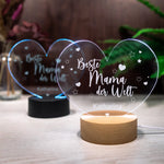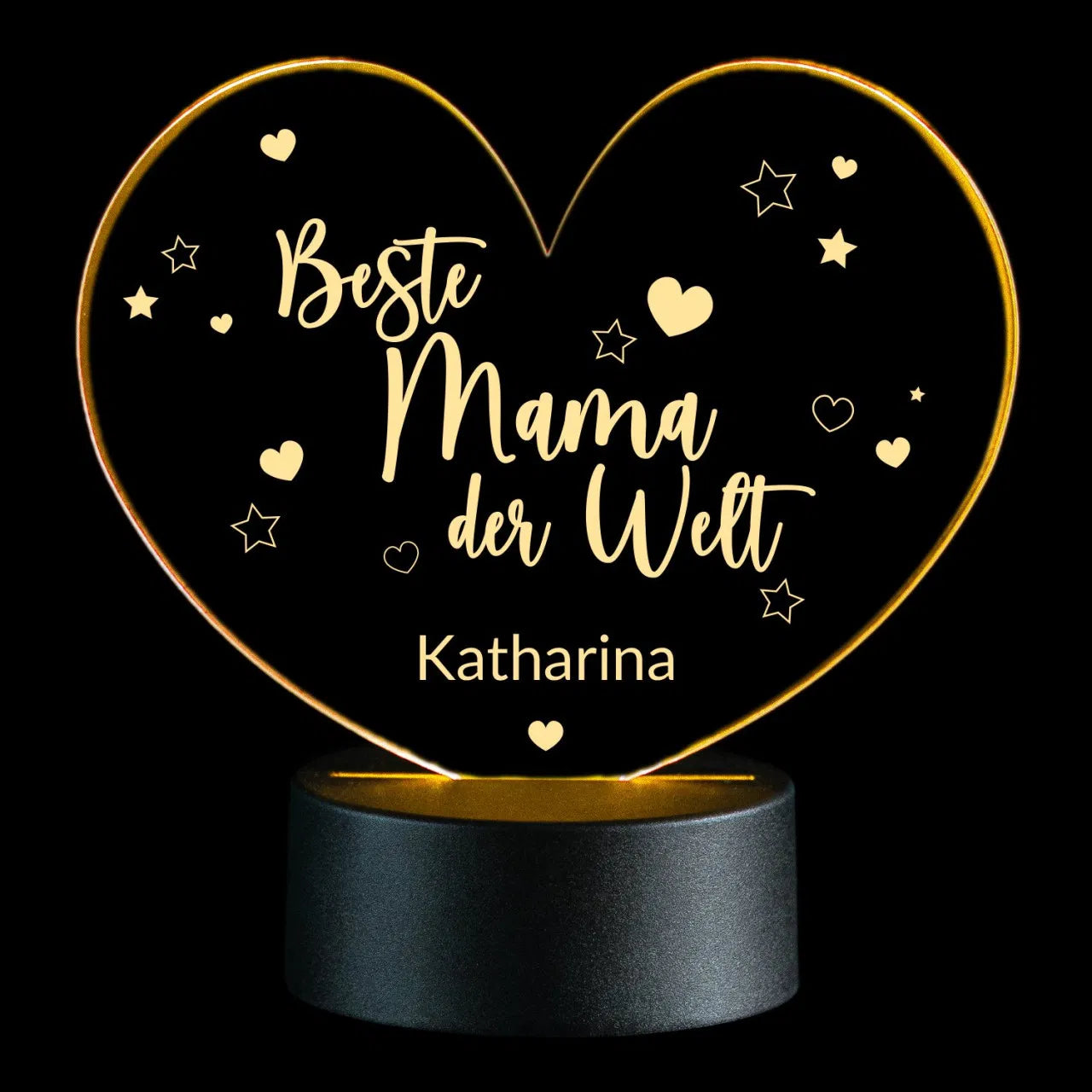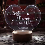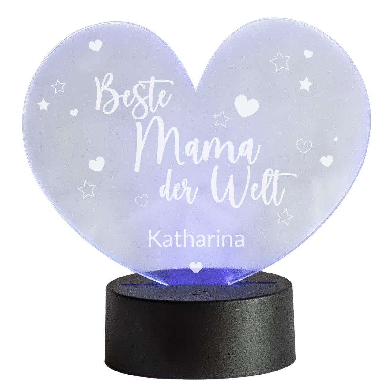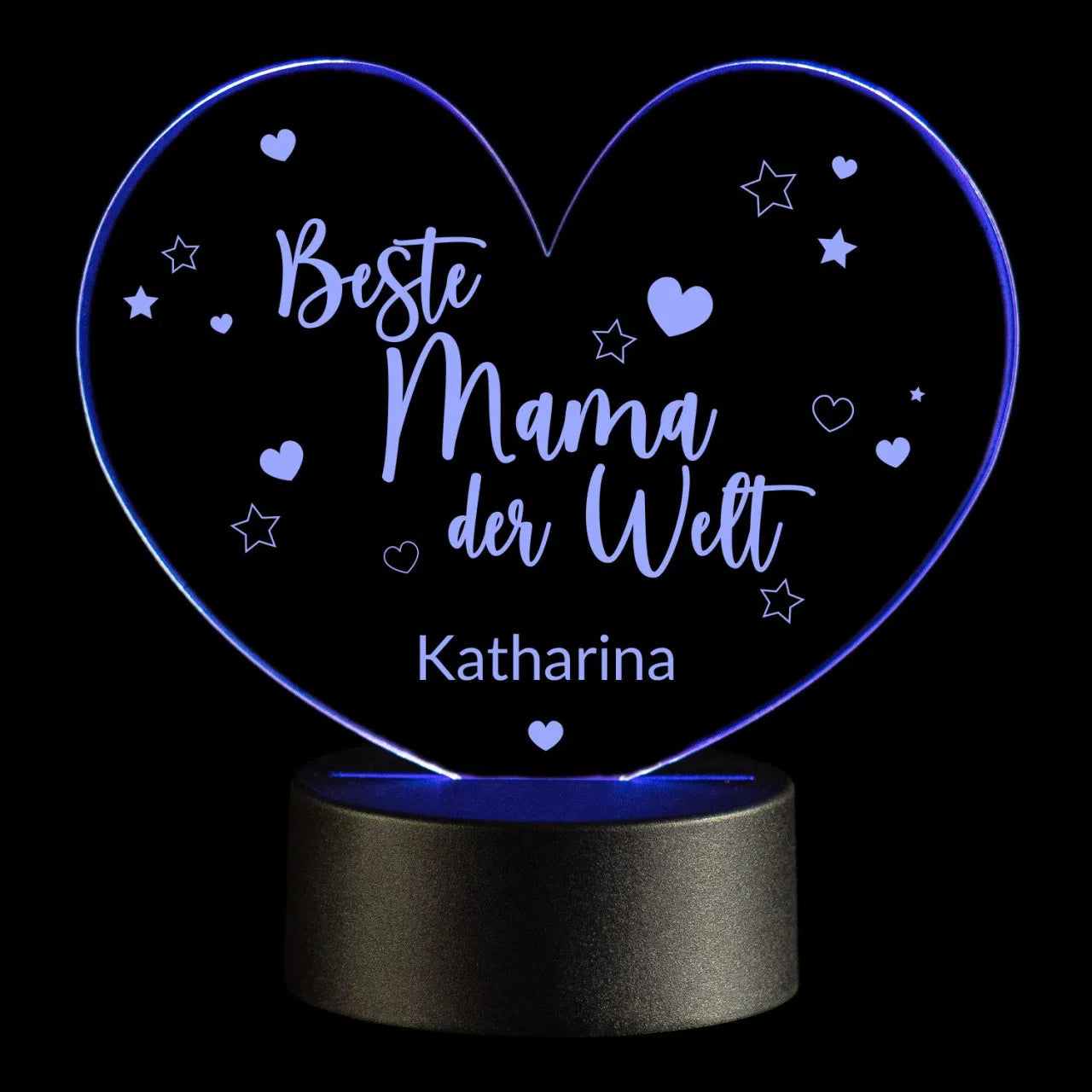 Du möchtest Deiner Mutter dieses Jahr eine besondere Freude zum Muttertag bereiten? Du möchtest ihr mit Deinem Geschenk zeigen, wie lieb Du sie hast? Lasse ihr zu Liebe ein Licht leuchten und überrasche sie mit einer LED-Leuchte in Herzform. Die Lampe verzaubert jeden Raum, wenn sie in den 7 verschiedenen Lichteinstellungen leuchtet. Die Gravur „Beste Mama der Welt“ wird Deine Mutter stets daran erinnern, wie dankbar Du ihr bist, dass sie immer für Dich da war und es auch immer sein wird. Vollkommen persönlich wird das Geschenk dank der Namensgravur, die wir auf dem Glas verewigen.