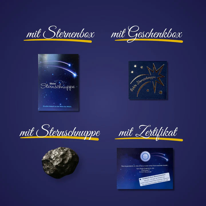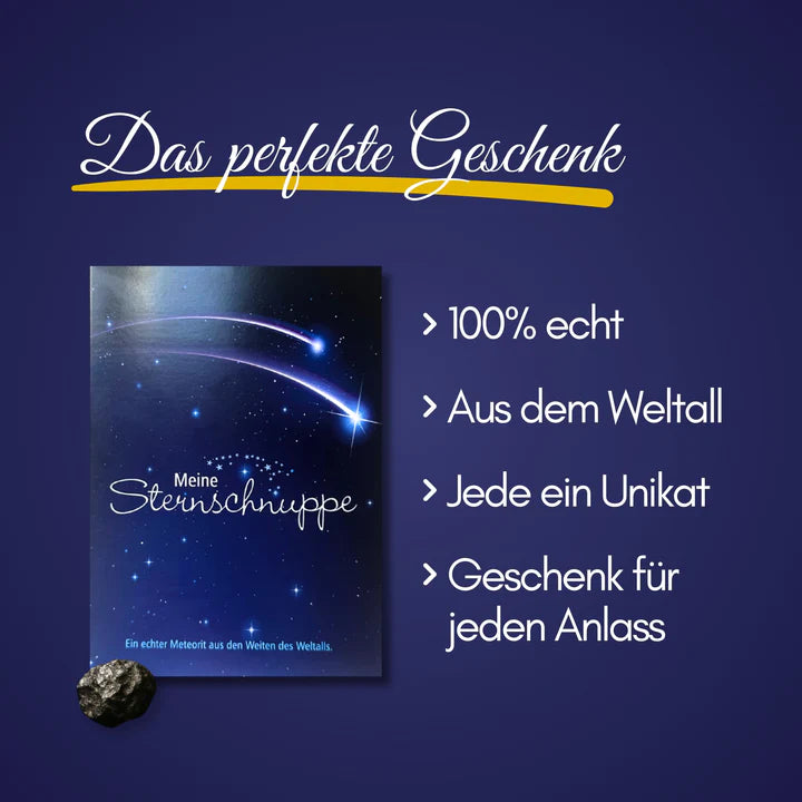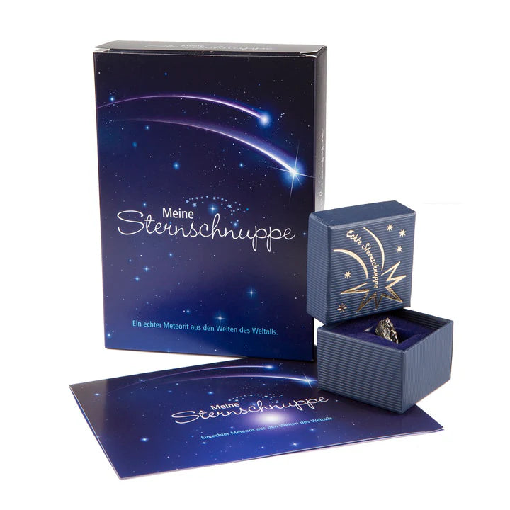 Die Sternschnuppe mit Geschenkbox und Grußkarte ist perfekt für alle, die das Einzigartige lieben und sich für das Universum begeistern. Ob Geburtstag, Weihnachten, Einschulung oder ein anderer besonderer Anlass – ein echter Meteorit sorgt garantiert für Staunen. Jede Sternschnuppe ist ein Unikat und trägt ihre eigene Geschichte aus den Weiten des Alls in sich. Ein Geschenk, das garantiert nicht alltäglich ist.