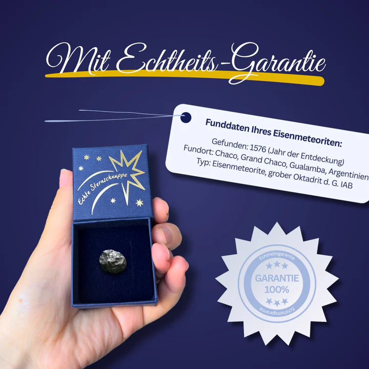 Die Sternschnuppe wiegt etwa 1 Gramm und wird in einer hochwertigen blauen Geschenkbox (ca. 3,2 x 5 x 5 cm) geliefert. Die Gesamtverpackung misst ca. 15,5 x 11 x 4 cm und enthält neben dem Meteoriten auch eine individuell beschriftbare Grußkarte. Das beiliegende Echtheitszertifikat bestätigt die Authentizität des Meteoriten. Ein kleines Stück Universum – stilvoll verpackt und bereit zum Verschenken.