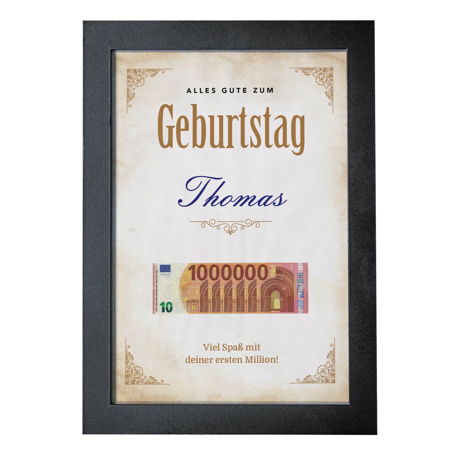 Feiere den besonderen Geburtstag mit einem einzigartigen Geldgeschenk: diesem kreativen Wandbild zur "Ersten Million". Platziere sechs gefaltete 10-Euro-Scheine, die zusammen eine Million symbolisieren. Personalisiere das Bild mit dem Wunschnamen – so wird es zum fröhlichen Hingucker an jeder Wand. Wähle zwischen verschiedenen Rahmenfarben oder ganz ohne Rahmen für den perfekten Look. Ein originelles Geschenk, das Freude und Überraschung garantiert!