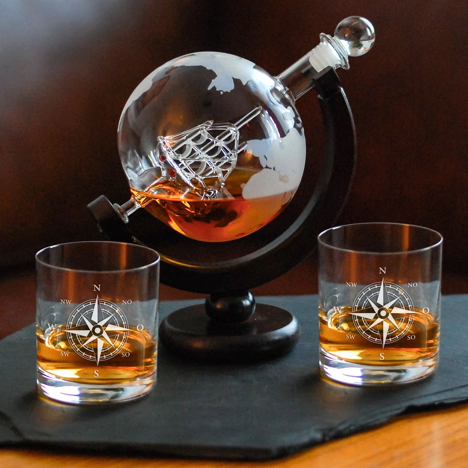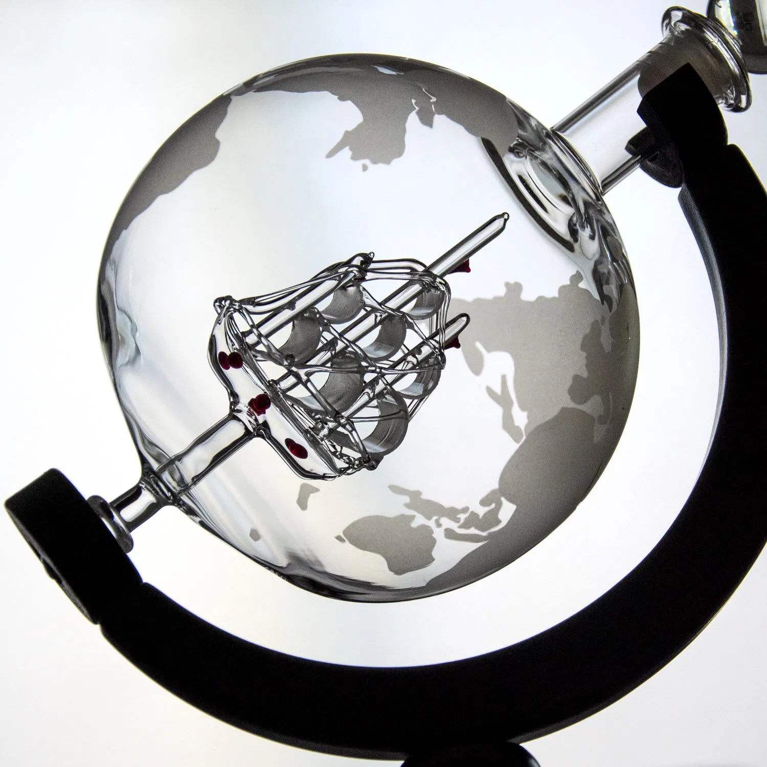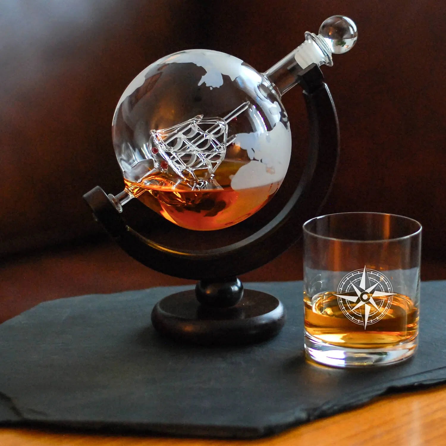 Im Inneren der Glas-Flasche befindet sich ein filigranes detailgetreues Glassegelschiff. Von außen gravieren wir die Karaffe mit einer Weltkarte im Globus-Design. Die bauchige Edelkaraffe sieht nicht nur außergewöhnlich aus, sondern sorgt auch dafür, dass Dein besonderer Tropfen, der vielleicht von einer Reise mitgebracht wurde, sicher gelagert werden kann.