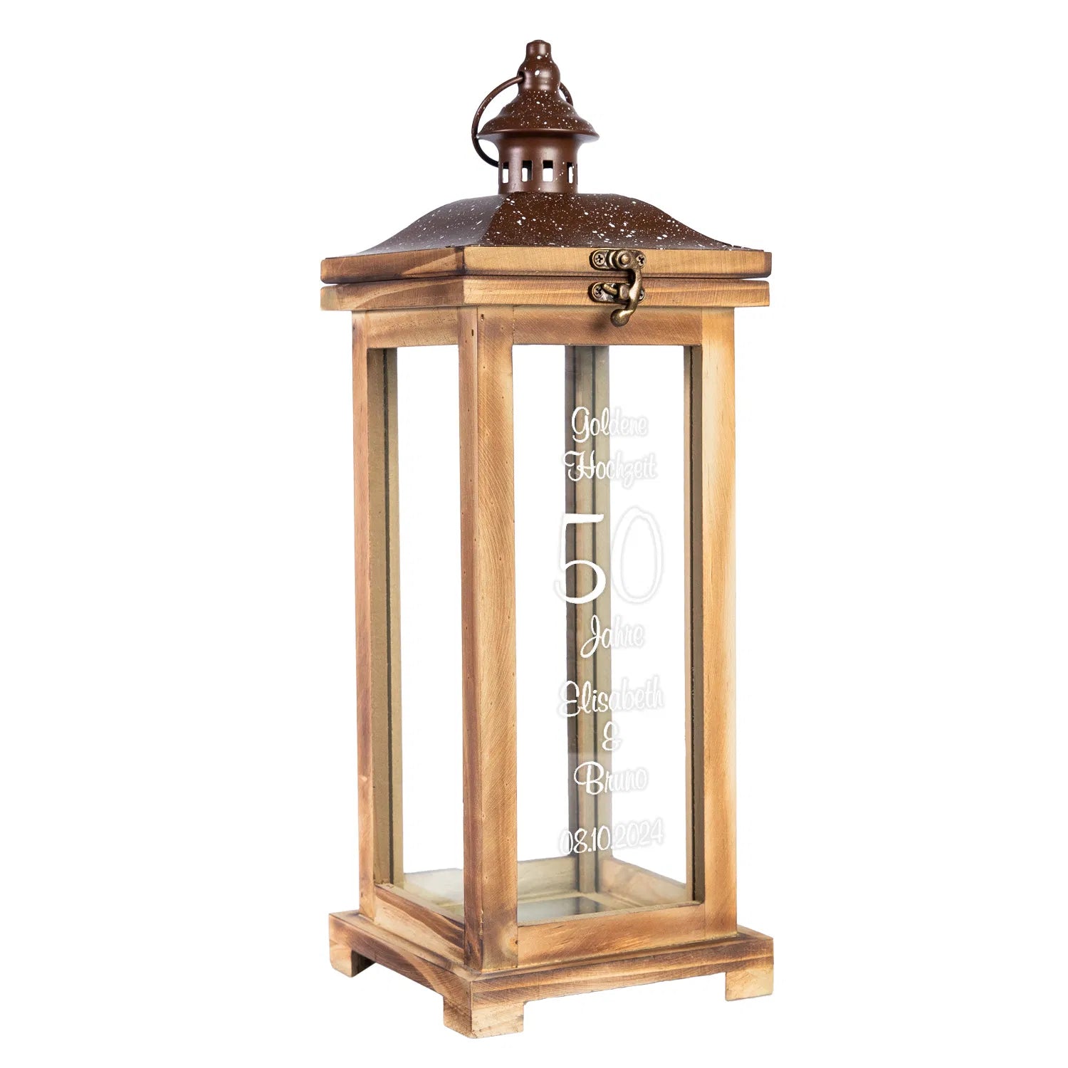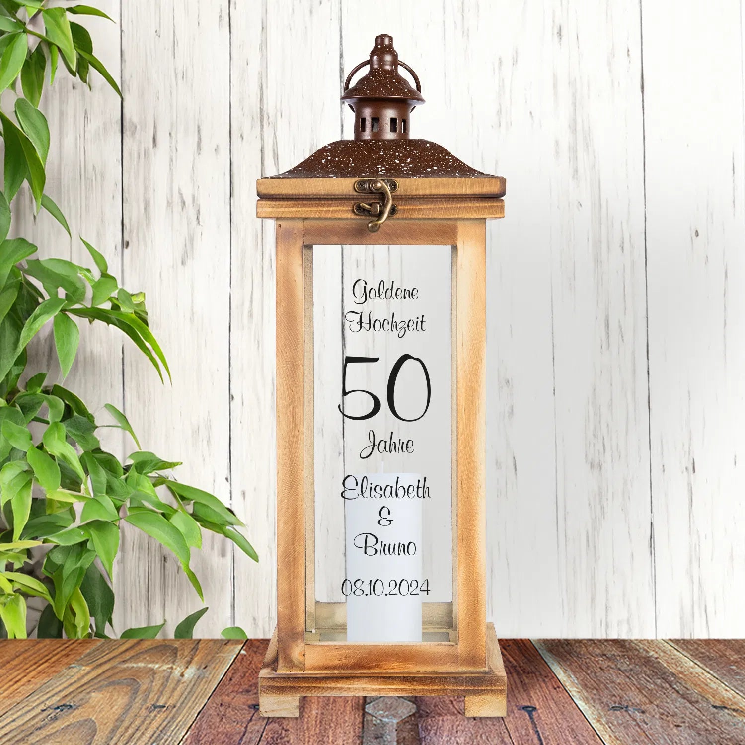 Zum 50. Hochzeitstag darf es etwas ganz Besonderes sein – wie diese elegante Landhauslaterne mit individueller Gravur zur Goldenen Hochzeit. Sie vereint rustikalen Charme mit persönlicher Note und wird so zum emotionalen Geschenk für ein Paar, das ein halbes Jahrhundert voller Liebe, Höhen und gemeinsamer Erinnerungen gefeiert hat.