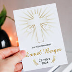 - Personalisierte Gestaltung: Optional kann die Karte mit dem Namen und dem Datum des Konfirmanden individualisiert werden, um eine persönliche Note hinzuzufügen.