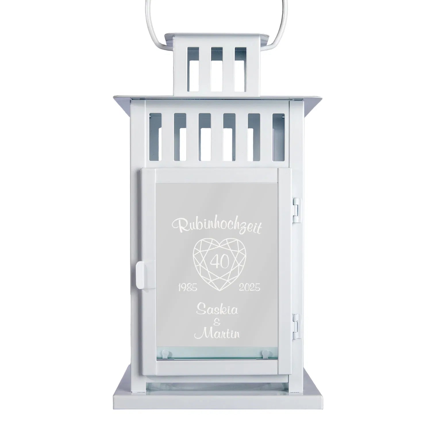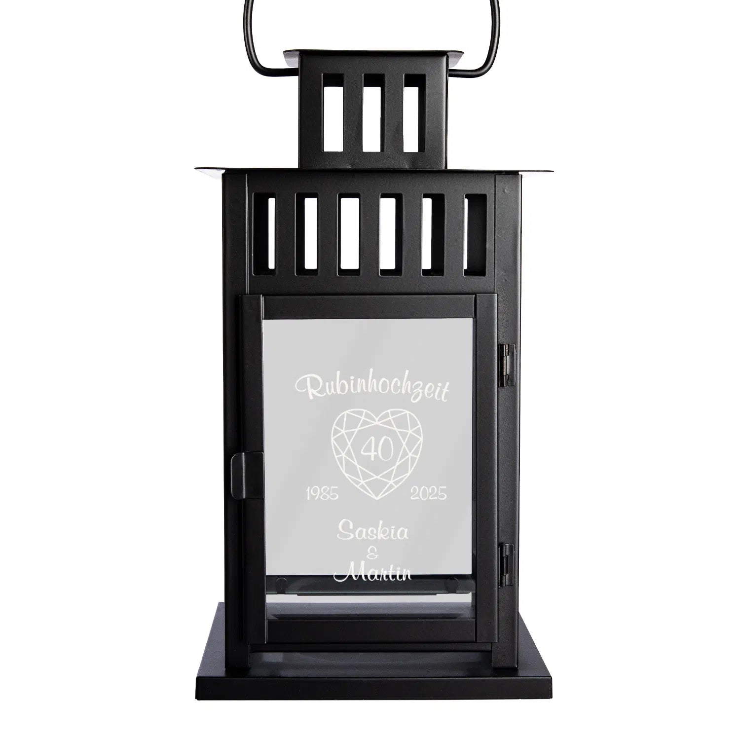 40 Jahre Liebe, Treue und gemeinsame Erinnerungen – die Rubinhochzeit ist ein ganz besonderes Jubiläum! Unsere hochwertige Laterne ist die perfekte Geschenkidee, um dieses Ehejubiläum stilvoll zu feiern. Sie wird mit zwei Wunschnamen und dem Hochzeitsdatum graviert und zaubert ein stimmungsvolles Licht für drinnen oder draußen.
