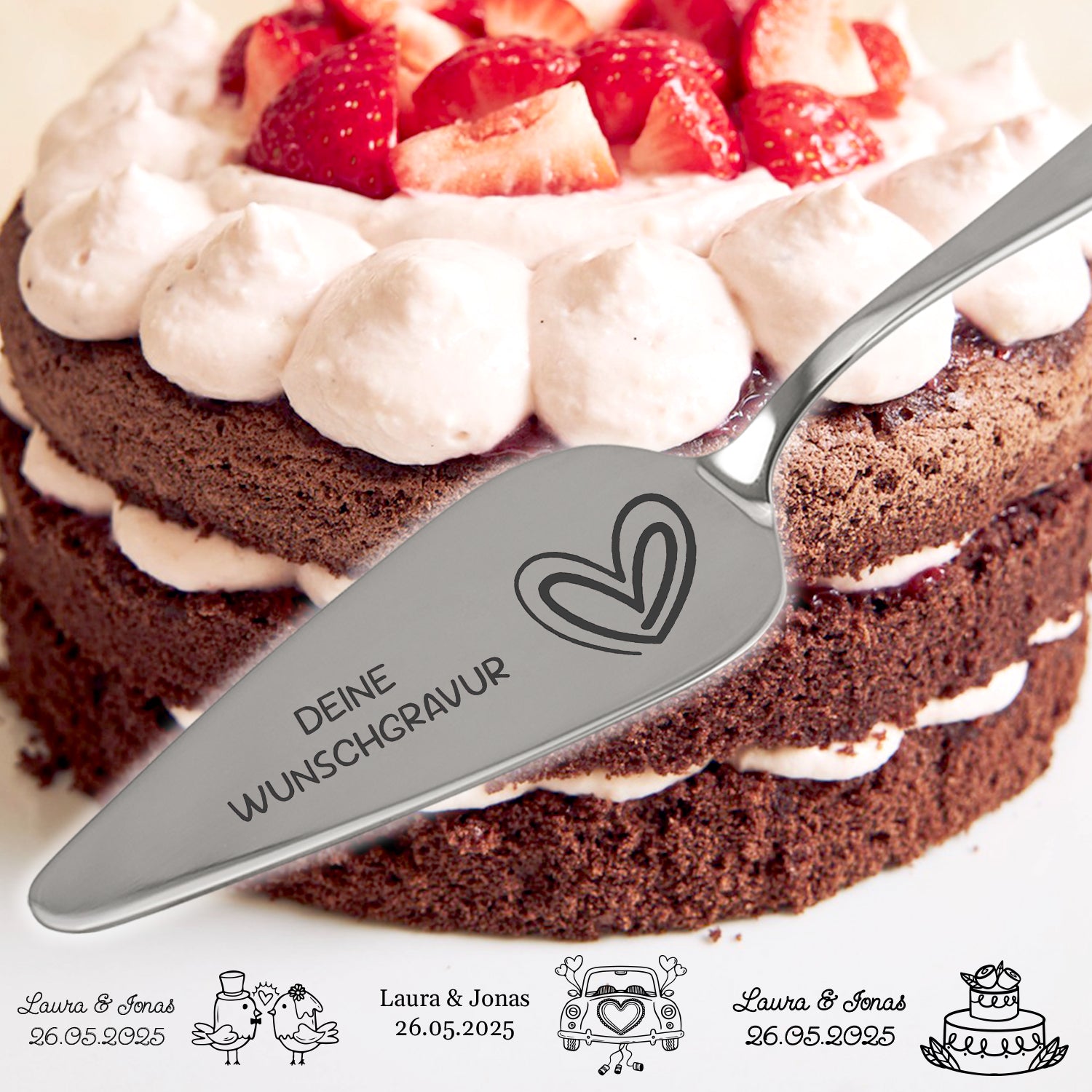 • Personalisierung: Alle Tortenheber werden mit den Namen des Brautpaares und dem Hochzeitsdatum graviert.