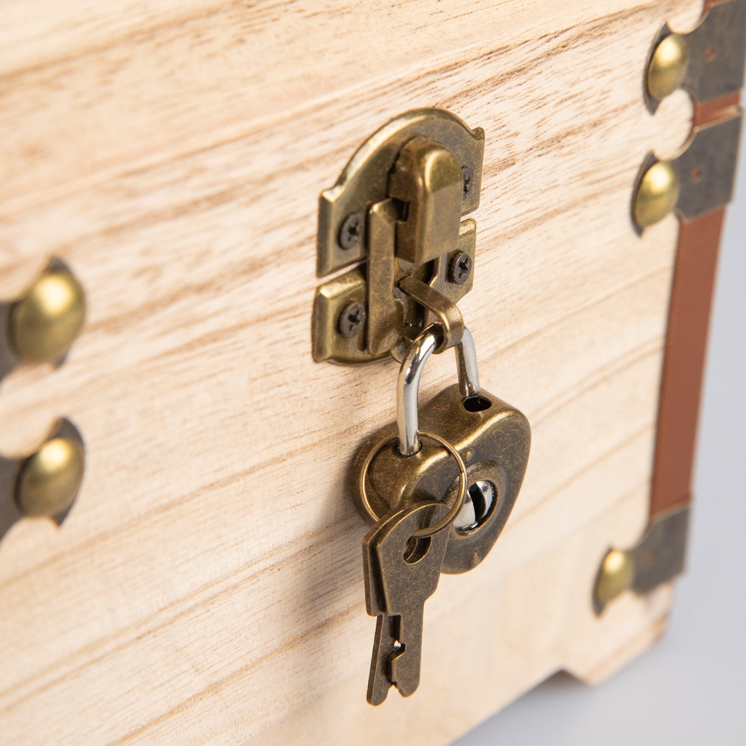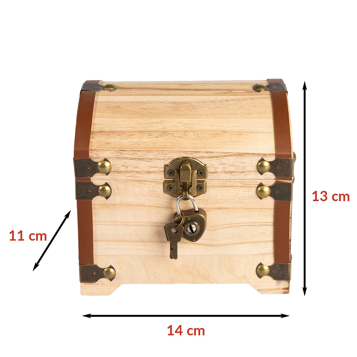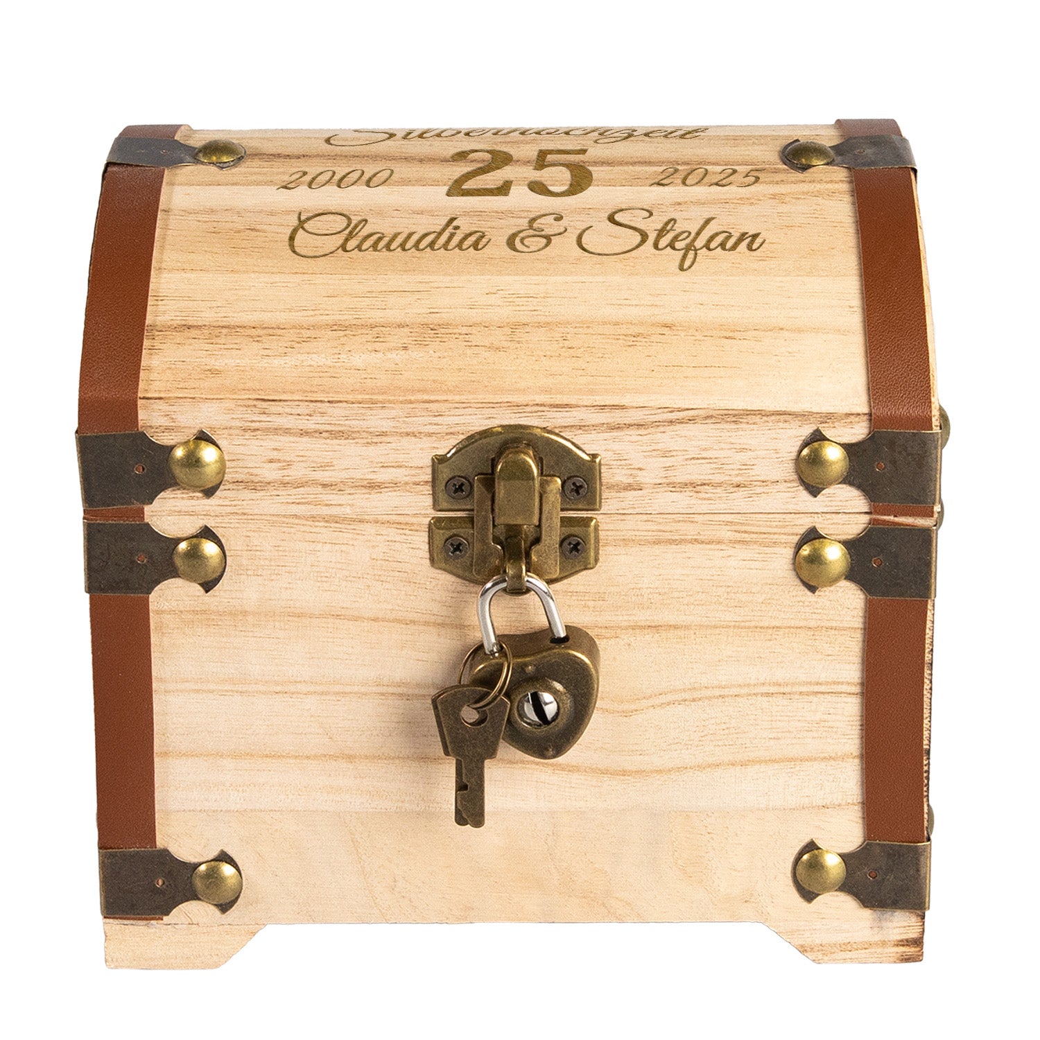Die Schatztruhe ist aus hellem Holz gefertigt und hat eine Größe von etwa 14 x 13,5 x 11 cm. Sie ist an den Ecken mit schönen Kunstleder- und Metallbeschlägen versehen, die ihr eine antike Optik verleihen. Passend zum Anlass ist der Deckel der Truhe mit dem Schriftzug "Silberhochzeit" und der Zahl 25 graviert. Passend zur Optik wird ein kleines Vorhängeschloss samt Schlüssel mitgeliefert.
