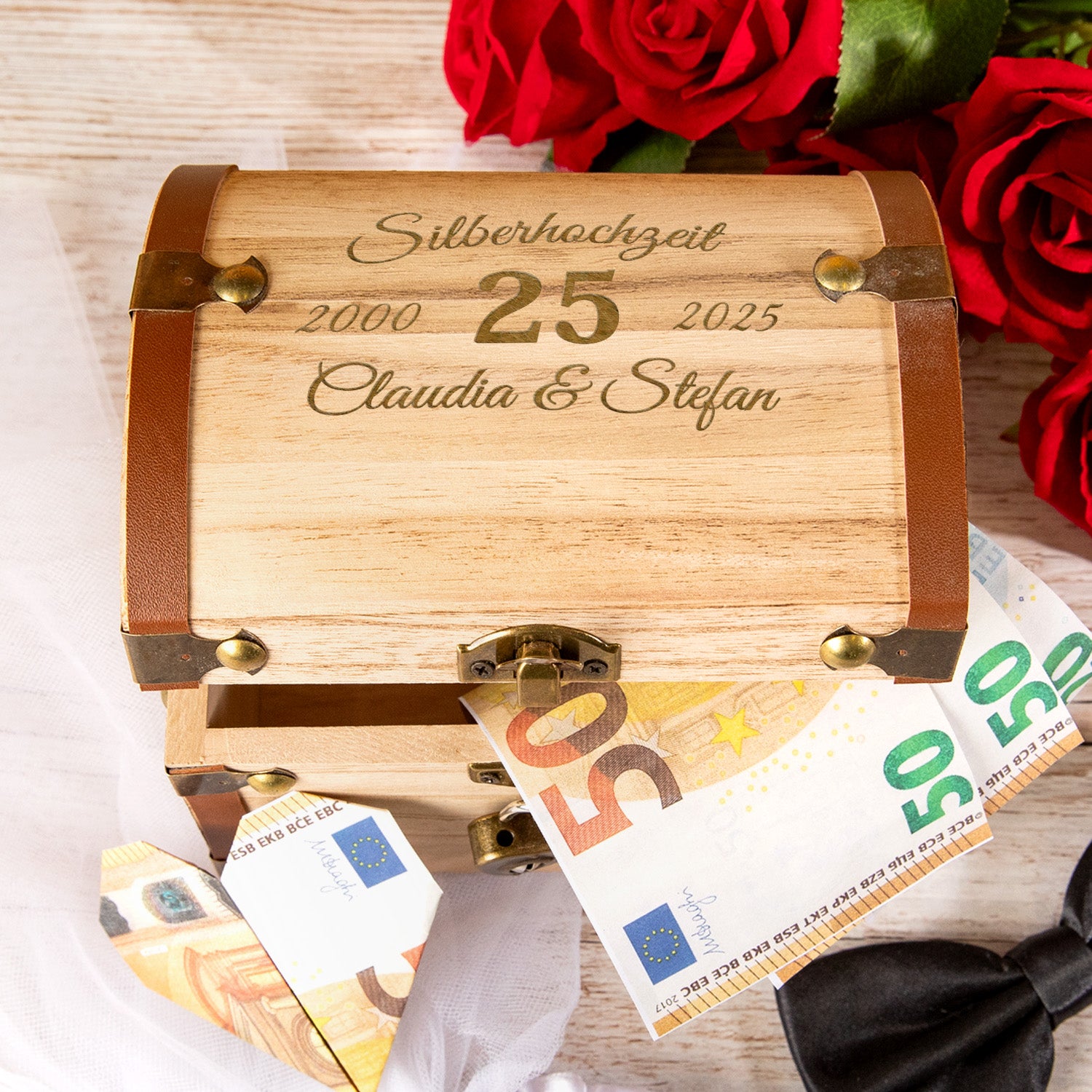 Du möchtest Familie, Freunde oder Bekannte zu einem besonderen Ehejubiläum, dem 25. Hochzeitstag, der als Silberhochzeit gefeiert wird, mit einem Geld- oder Gutscheingeschenk überraschen? Die perfekte Geschenkverpackung für diese Art von Geschenken ist die Schatztruhe - Silberhochzeit. Eine kleine Schatztruhe, die garantiert zu einem Hit wird.