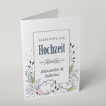 Überrasche das Brautpaar mit einer Grußkarte, die ihre Hochzeit noch unvergesslicher macht. Unser Motiv "Floral" verleiht jedem Glückwunsch eine persönliche Note und bringt die Schönheit des Anlasses zum Ausdruck. Mit dem Schriftzug "Alles Gute zur Hochzeit" und der Option, zwei Wunschnamen hinzuzufügen, wird jede Karte zu einem individuellen Geschenk, das das Brautpaar für immer schätzen wird.
