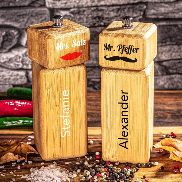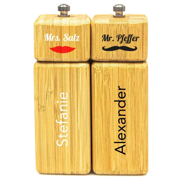 - Individuell personalisiert: Die Salzmühle ist mit dem Motiv Mrs. Salz bedruckt, die Pfeffermühle mit dem passenden Mr. Pfeffer. Beide Mühlen werden jeweils mit Deinen Wunschnamen versehen