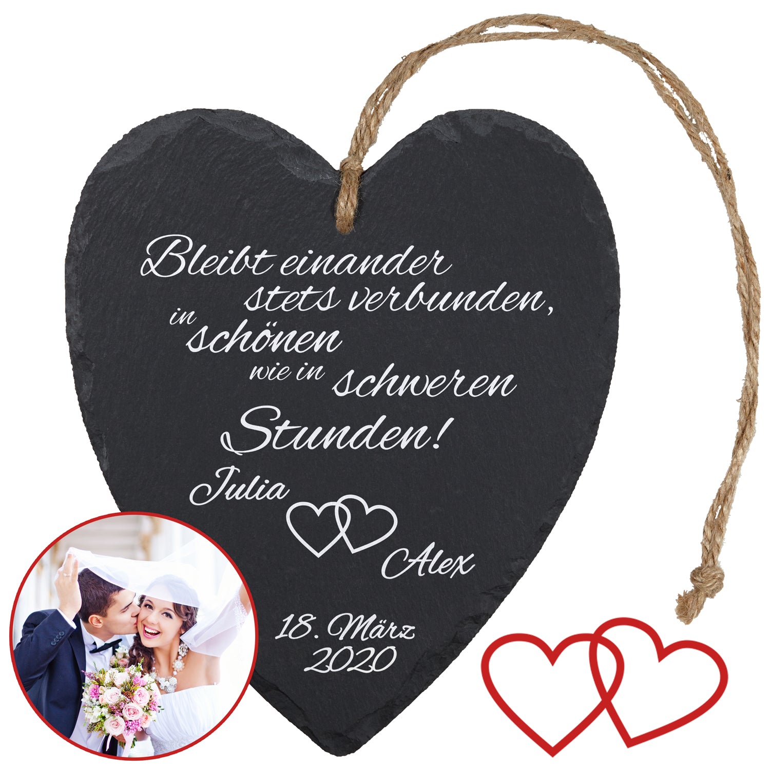 Du suchst ein besonderes Hochzeitsgeschenk für ein befreundetes Liebespaar? Deine Schwester oder Dein Bruder heiratet bald? Das Herz aus Schiefer ist ein unvergessliches Präsent, welches das Jubelpaar noch lange nach der Eheschließung an ihren Traumtag erinnern wird. Der Hochzeitswunsch "Bleibt einander stets verbunden, in schönen wie in schweren Stunden" verziert die Schieferplatte und zeigt dem Ehepaar noch nach der Hochzeit liebevoll den Sinn einer Ehe auf.