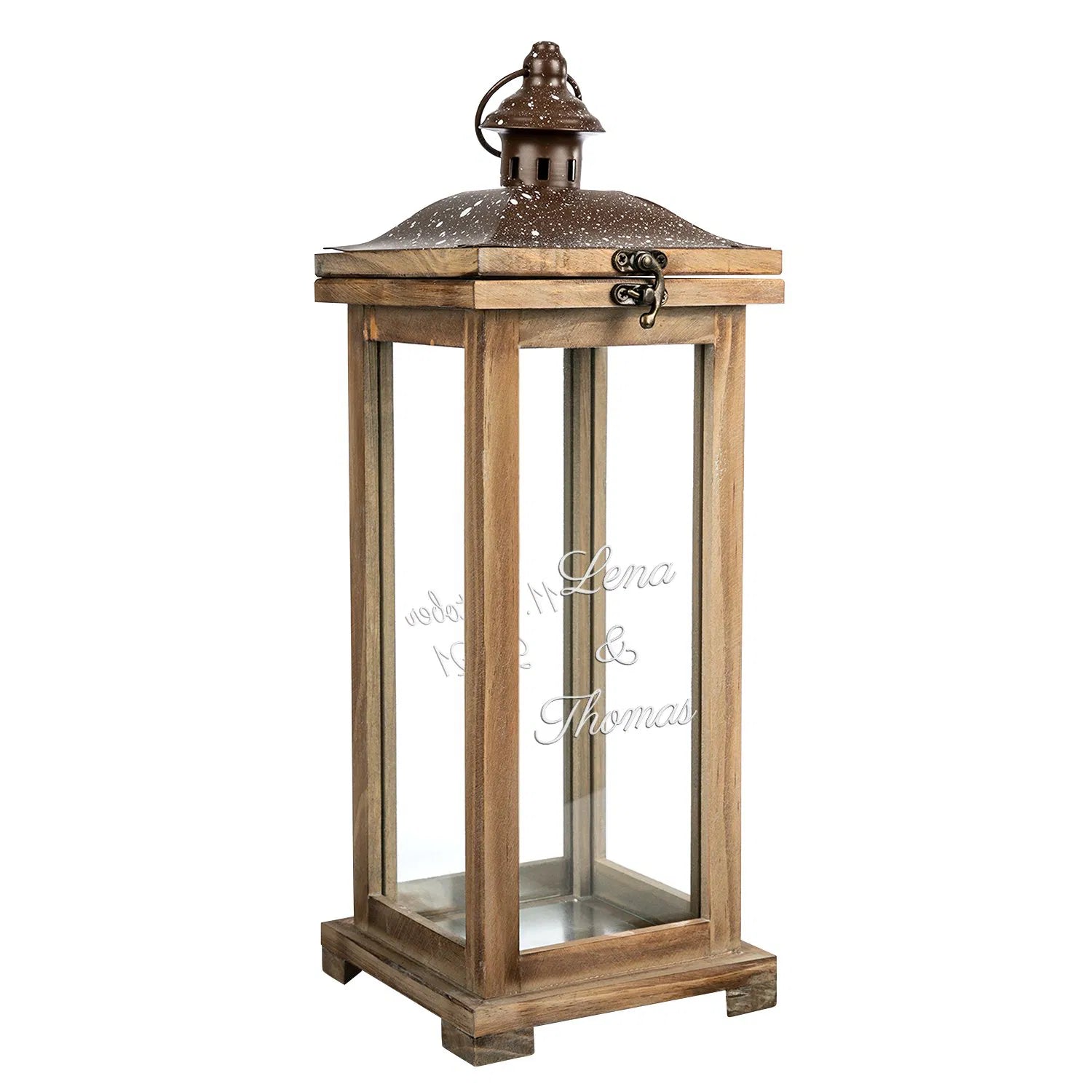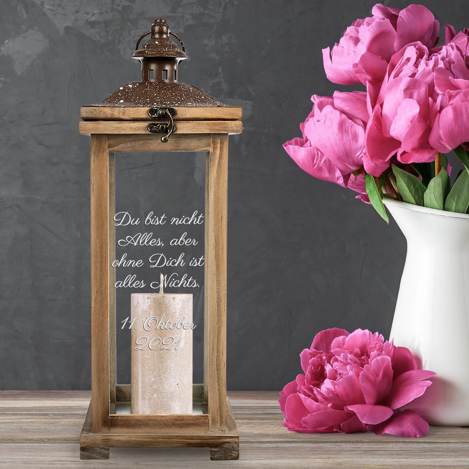 Diese stilvolle Laterne im charmanten Landhausstil ist mehr als nur ein Dekostück – sie ist ein individuelles Geschenk mit Bedeutung. Ob als persönliches Präsent zur Hochzeit, zum Geburtstag, zum Einzug oder als Gedenklicht: Die hochwertige Laterne aus Holz und Metall wird mit Deinem persönlichen Wunschtext graviert und macht dadurch jeden Anlass zu etwas ganz Besonderem.