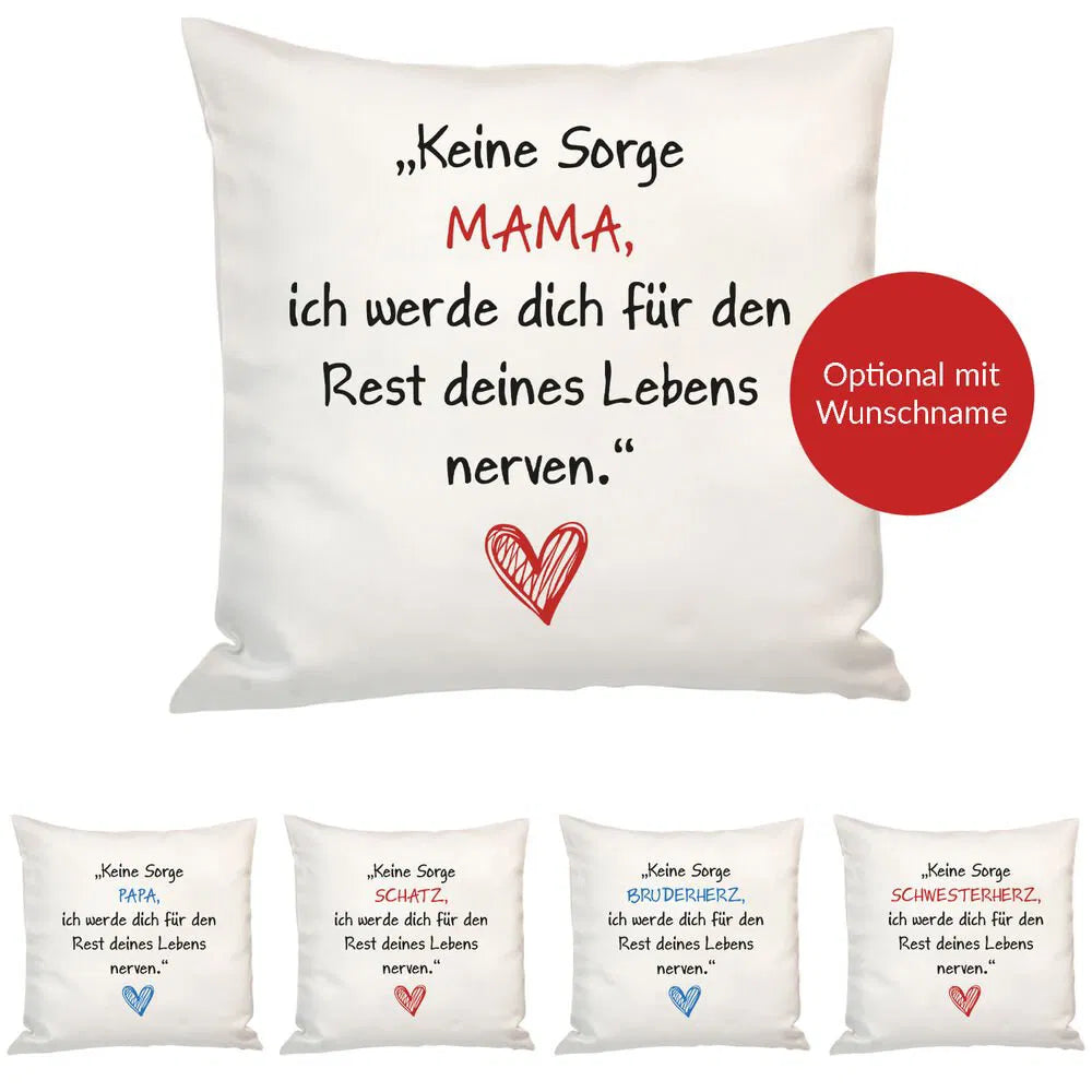 Verschenke doch einmal ein ganz besondere und originelle Geschenkidee an Deinen Lieblingsmenschen. Dieses Kissen mit coolem Spruch ist eine sehr ausgefallene Geschenkidee. Der humorvolle Spruch: "Keine Sorge, ich werde dich für den Rest deines Lebens nerven!" steht als Aufdruck auf dem Kissen. Überreiche Dein Kissengeschenk zum Geburtstag, zu Weihnachten, zum Muttertag, zum Vatertag, zum selbsternannten beste Schatzitag oder einfach mal als liebevoll-witzige Geste zwischendurch um Dich einfach mal für alles zu bedanken.