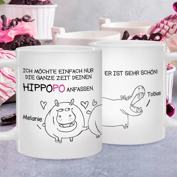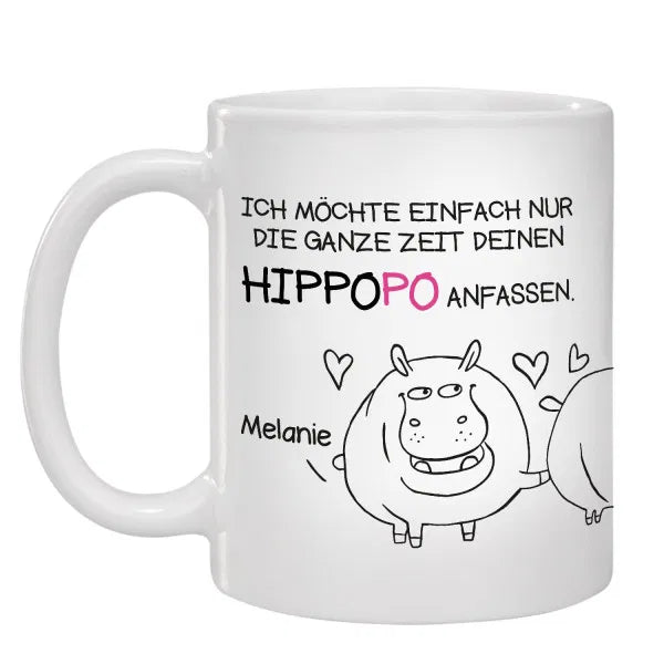 Die Tasse ist aus Keramik gefertigt und verfügt über ein Fassungsvermögen von 330 ml. Wählen kannst Du aus zwei verschiedenen Aufdruck-Motiven. Zur Auswahl steht das Motiv mit zwei süßen Männchen und dem Spruch „Ich möchte einfach nur die ganze Zeit deinen Hintern anfassen. Er ist sehr schön“ oder Du wählst das Hippo-Motiv mit dem Spruch „Ich möchte einfach nur die ganze Zeit deinen Hippopo anfassen. Er ist sehr schön“. Beide Motive werden mit Deinen 2 Wunschnamen komplettiert und machen die Tasse so zu einem einzigartigen und ganz persönlichen Liebesgeschenk.