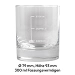 Das hochwertige Whiskyglas überzeugt durch seine hochwertige Verarbeitung. Es ist mit einem Fassungsvermögen von 300 ml ausgestattet und hat eine Größe von 8,8 x 8 cm. Der besondere Clou des Glases ist das Gravurmotiv. Wir bedrucken das Glas wahlweise mit den Worten "Einfach - Doppelt - Wunschname". Dein Wunschname macht dieses Glas zu einem ganz persönlichen Geschenk, welches jedem Whiskyfan ein Lächeln abgewinnen wird. Mit diesem Glas kann der Beschenkte zeigen, dass er ein echter Kerl ist!