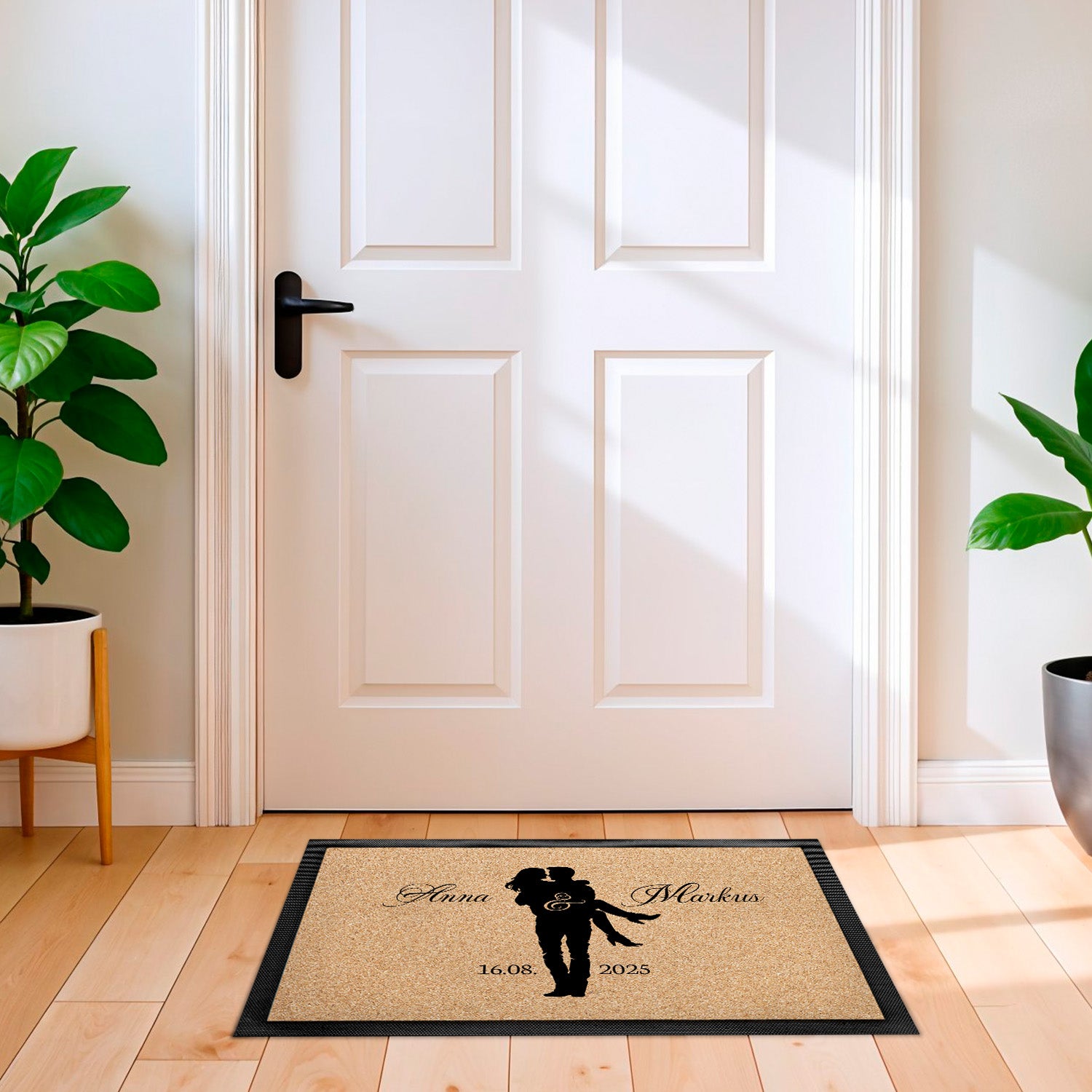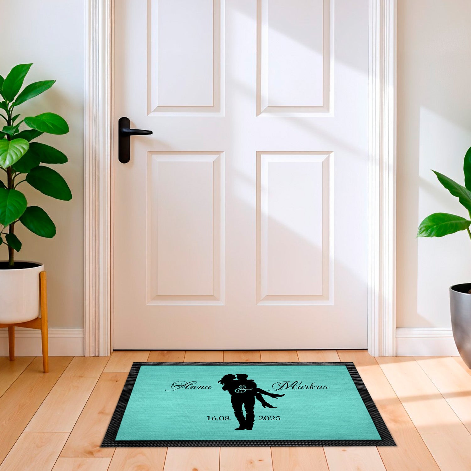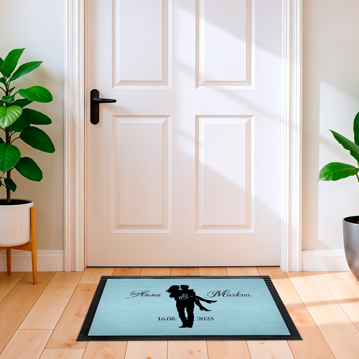 Diese Fußmatte sagt mehr als tausend Worte: Mit der eleganten Silhouette eines Hochzeitspaars sowie Euren beiden Wunschnamen und einem besonderen Datum wird sie zum stilvollen Hingucker vor jeder Haustür. Ob als Geschenk zur Hochzeit, zum Einzug oder zum Valentinstag – diese personalisierte Fußmatte verleiht jedem Eingangsbereich eine liebevolle Note.