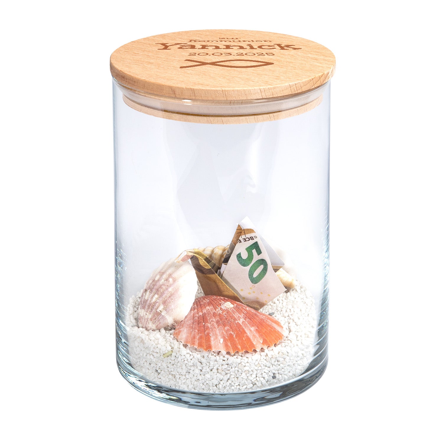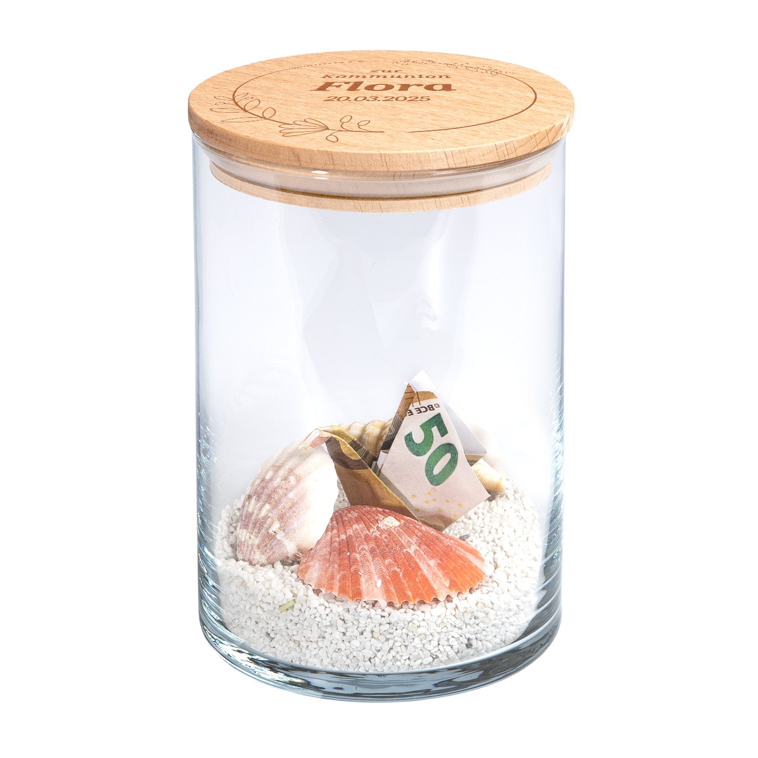 Ein Geschenk mit Bedeutung – schlicht, stilvoll und vielseitig. Unser personalisierbares Keksglas ist eine liebevolle Idee zur Heiligen Kommunion. Ob als besondere Verpackung für ein Geldgeschenk oder später als Keks- und Erinnerungsglas – es begleitet das Kommunionskind über viele Jahre hinweg.