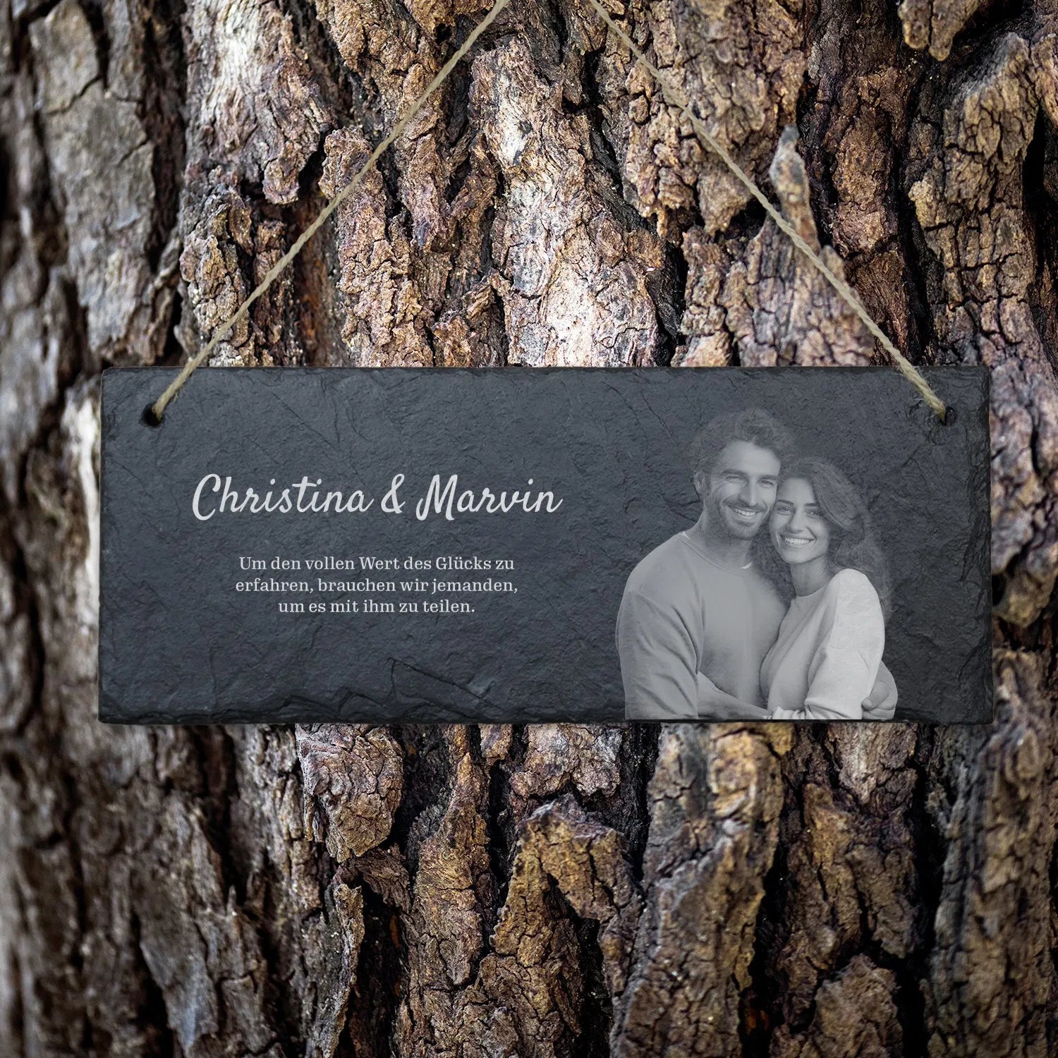 Du suchst nach einem Geschenk, das nicht nur charmant ist, sondern auch eine persönliche Note trägt? Unsere Schiefertafel mit Wunschfoto ist die perfekte Wahl! Dieses einzigartige Fotogeschenk wird zu einem Erinnerungsstück, das jede Beziehung und jedes Paar auf besondere Weise ehrt. Mit rustikalem Schiefer und einer eleganten Gravur wird diese Tafel zu einem zeitlosen Pärchengeschenk, das eure Verbundenheit zelebriert.