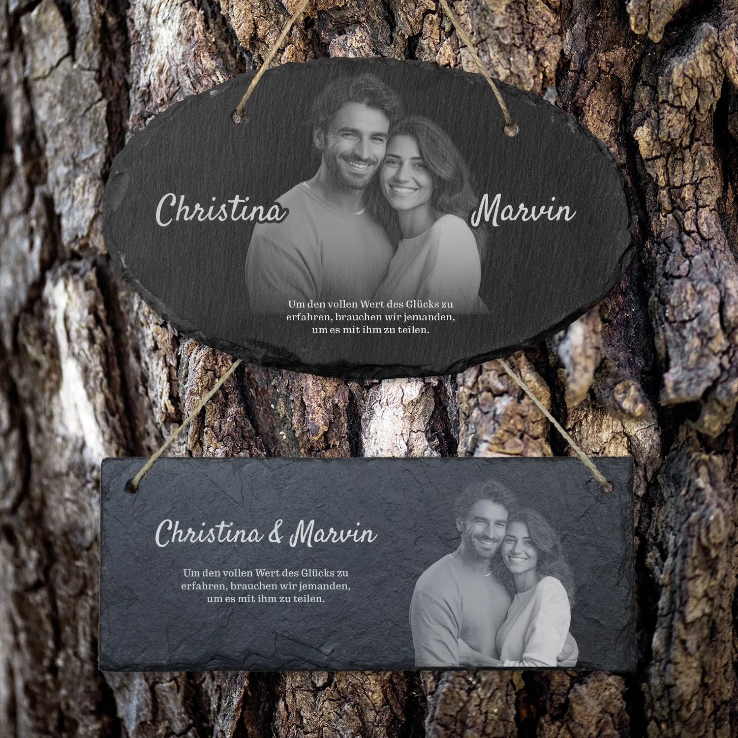 Wähle zwischen der ovalen Variante (20 x 10 cm) oder der eckigen Version (25 x 10 cm) und gestalte Deine Schiefertafel mit einem Wunschfoto, den Namen des Paares und einem persönlichen Text. Beachte dabei, dass das Foto idealerweise die abgebildete Person nicht im oberen Bereich abschneidet, um das bestmögliche Ergebnis zu erzielen. Für zusätzliche Sicherheit bieten wir unseren optionalen Foto-Check an, der sicherstellt, dass Dein Bild unseren Qualitätsstandards entspricht. Bestelle jetzt und überrasche Dein Lieblingspaar mit diesem einzigartigen Pärchengeschenk, das Emotionen weckt und die Freude am Schenken in den Vordergrund stellt.