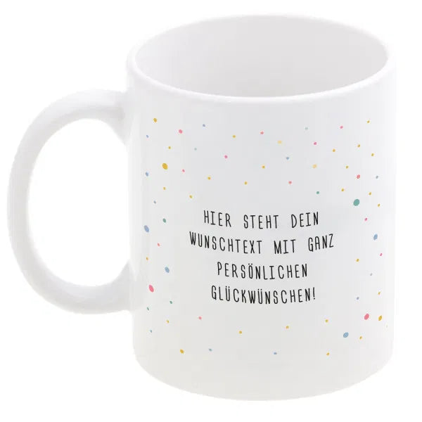Für Deine Personalisierung mit Wunschtext stehen Dir 90 Zeichen zur Verfügung und für Deinen Wunschnamen hast Du 16 Zeichen frei. Der Becher ist aus weißer Keramik gefertigt und glasiert. Er ist mit bunten Pünktchen bedruckt. Dein Geschenk ist spülmaschinengeeignet und hat eine Höhe von 9,5 cm bei einem Fassungsvermögen von 330 ml.