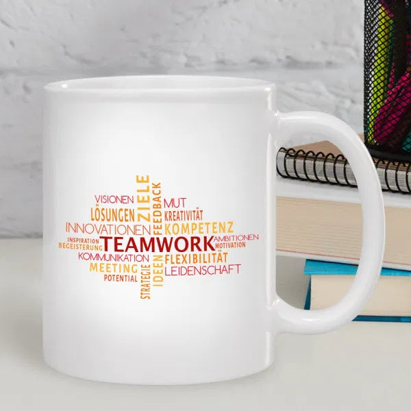 - 2 Farbvarianten: Die weiße Keramiktasse wird mit Begriffen zum Thema Teamwork bedruckt. Der Aufdruck ist in der Farbvariante Blau/Grün oder Rot/Orange bestellbar.
