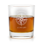 Das Whiskyglas ist 8,8 cm hoch und besitzt einen Durchmesser von 8 cm. Als besonderes Highlight verewigen wir das Motiv eines Kompasses auf dem Glas. Für die persönliche Gravur stehen Dir drei verschiedene Möglichkeiten zur Auswahl: Wahlweise verewigen wir einen Wunschnamen und ein Datum Deiner Wahl; zwei Wunschnamen oder zwei Wunschnamen und die Koordinaten eines für dich bedeutsamen Ortes. Gib uns für die letzte Variante einfach die Adresse des Ortes (Ort mit PLZ., Straße und ggf. Hausnummer).