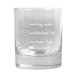Das elegante Whiskyglas hat ein Fassungsvermögen von etwa 320 ml und zeichnet sich durch seine Qualität und hochwertige Verarbeitung aus. Es ist mit drei Füllbegrenzungen gekennzeichnet, an denen der Stressgehalt des Tages gemessen wird. Die Markierungen „Frag nicht!“, „Schlechter Tag!“ und „Guter Tag!“ werden um drei witzige Smileys ergänzt, die die Stimmung der Ausrufe widerspiegeln.