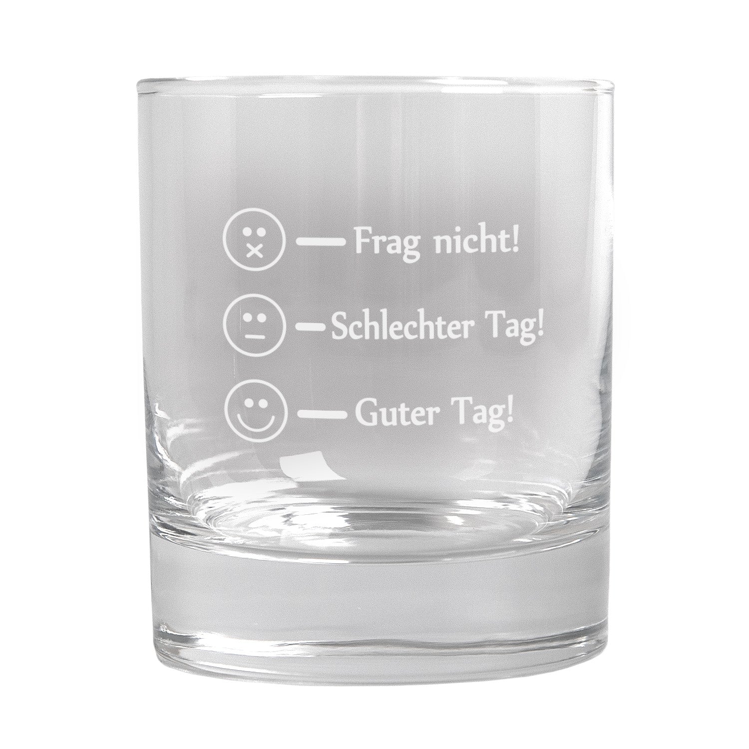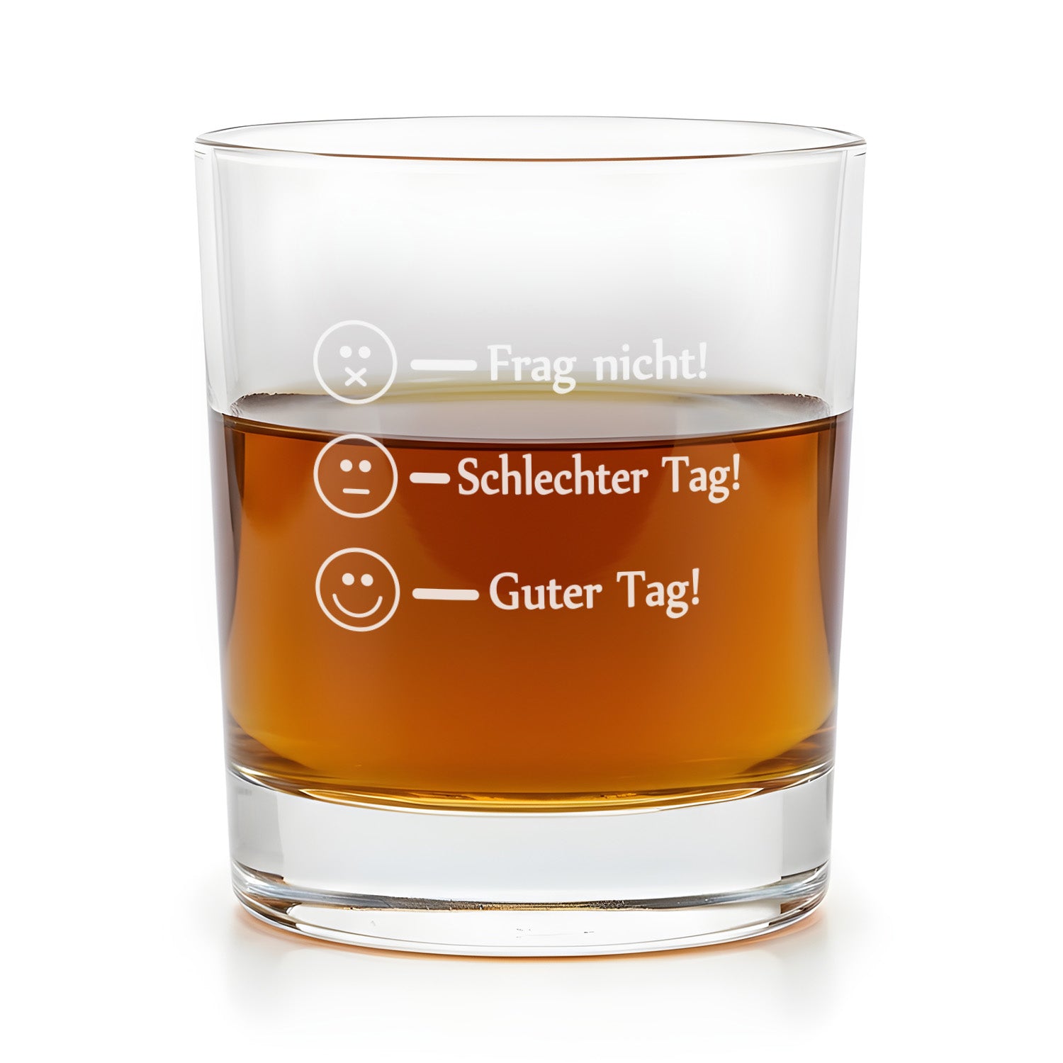 Überrasche einen ganz besonderen Menschen in Deinem Leben mit dem Whiskyglas - Smiley, aus dem der Beschenkte seinen Lieblingswhisky in Zukunft mit einem Lächeln genießen wird. Je nachdem wie gut oder schlecht der Tag war, wird das Glas wahlweise bis zur „Frag nicht!“-Markierung oder nur bis zur „Guter Tag!“-Markierung befüllt.