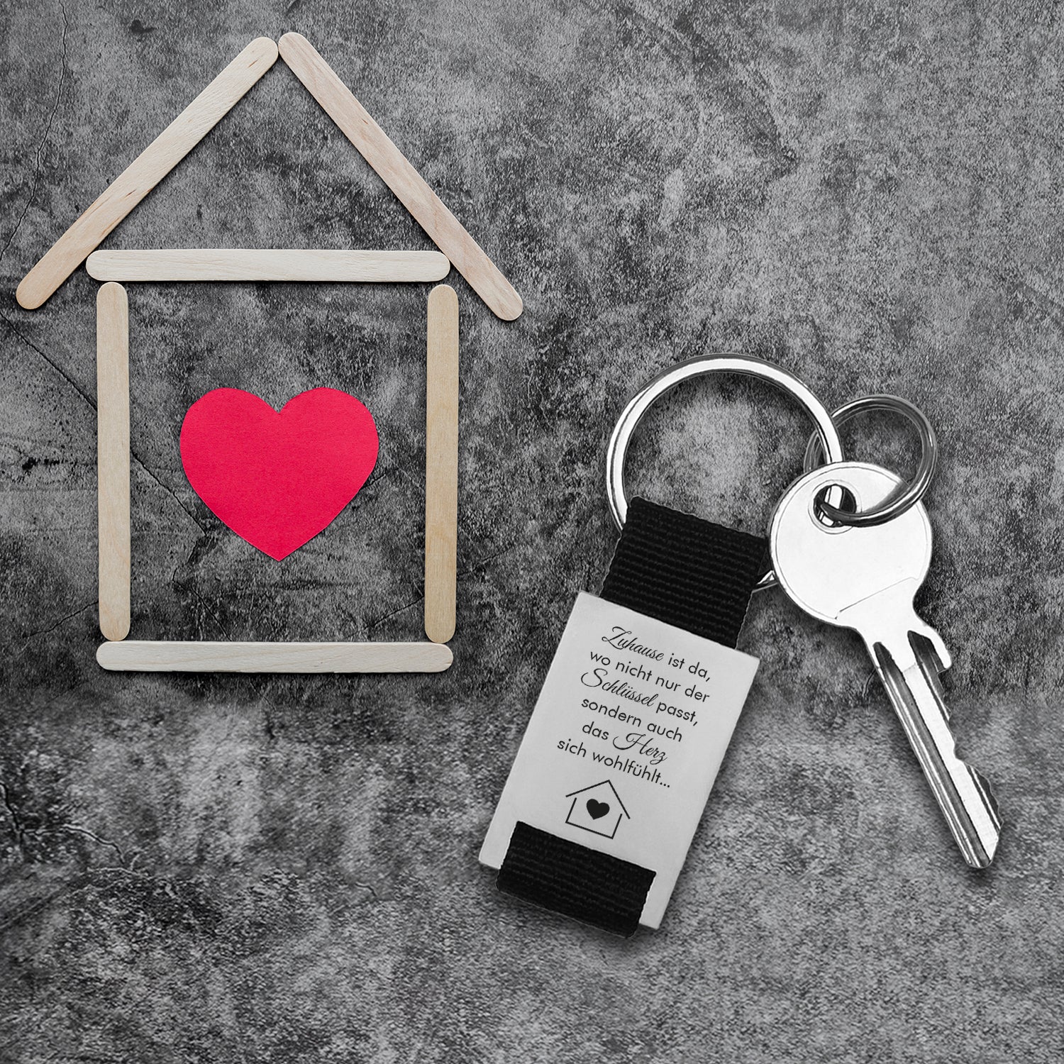 • Gravur: Der Schlüsselanhänger wird mit einem wunderschönen Zitat graviert. - „Zuhause ist da, wo nicht nur der Schlüssel passt, sondern auch das Herz sich wohlfühlt…“.