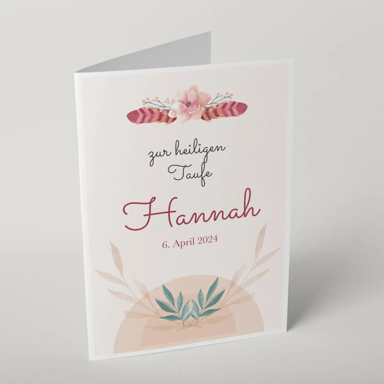 Unsere Grußkarte zur heiligen Taufe im Boho Style ist nicht nur eine herzliche Botschaft, sondern auch eine wunderschöne Ergänzung zu jedem Taufgeschenk. Das florale Design verleiht ihr einen besonderen Charme und macht sie zu einem zeitlosen Erinnerungsstück. Durch die Möglichkeit, den Namen und das Datum des Täuflings hinzuzufügen, wird die Karte zu einem individuellen und persönlichen Geschenk. Zeige Deine Liebe und Wertschätzung für den kleinen Täufling.