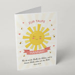 Überrasche die Eltern des Täuflings mit einer liebevollen Geste, die ihren Tag noch sonniger macht. Unsere Grußkarte zur Taufe mit einem zauberhaften Sonnenmotiv ist genau das Richtige, um Deine Glückwünsche auf warmherzige Weise zu übermitteln. Die strahlende Sonne auf der Vorderseite versprüht Freude und Optimismus und macht diese Karte zu einem besonderen Blickfang.