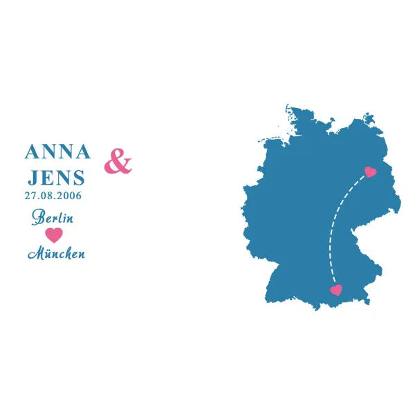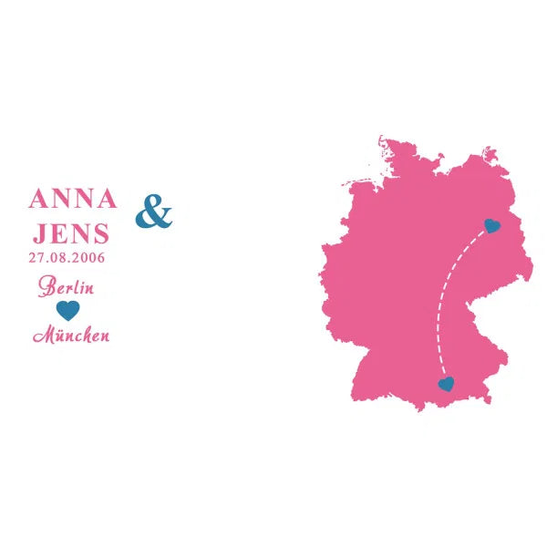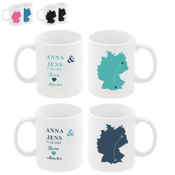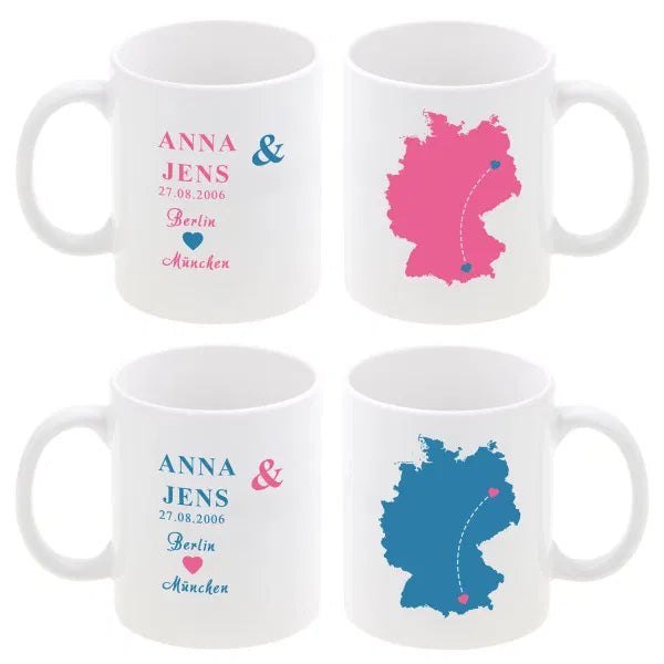 Die beiden Becher im Set bestehen aus Keramik und fassen bei einer Höhe von 9,5 cm und einem Durchmesser von 8,2 cm etwa 330 ml. Sie werden mit einer Karte von Deutschland, Europa oder der Welt bedruckt, auf der eure beiden Orte mit Herzen gekennzeichnet und verbunden werden. Die beiden Orte sowie auch ein Datum und zwei Namen Deiner Wahl sind auch auf der anderen Seite des Bechers noch einmal abgebildet. Du hast die Wahl zwischen einer pink -blauen, mint-dunkelblauen oder rot-schwarzen Farbvariante.