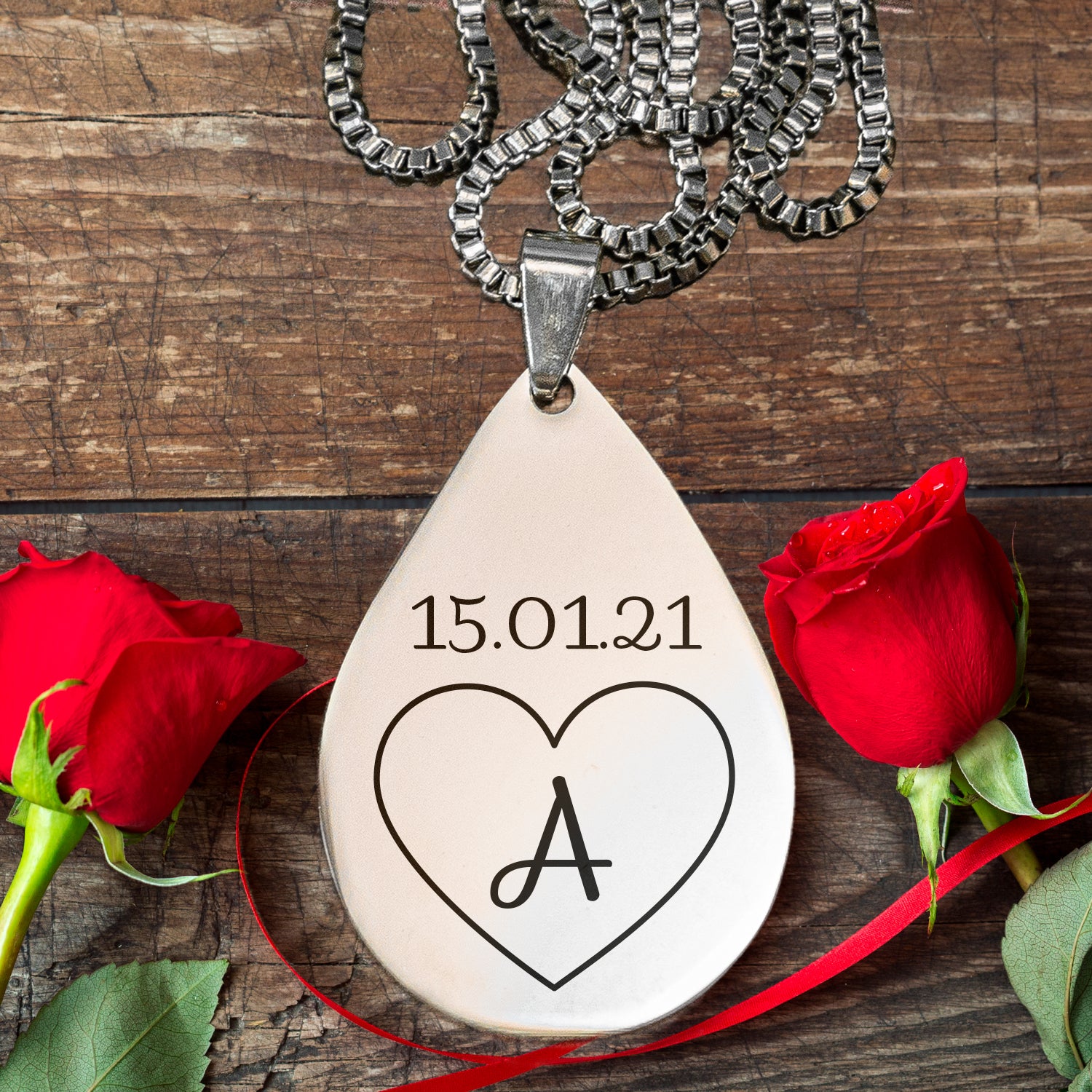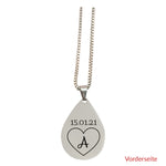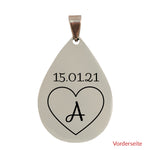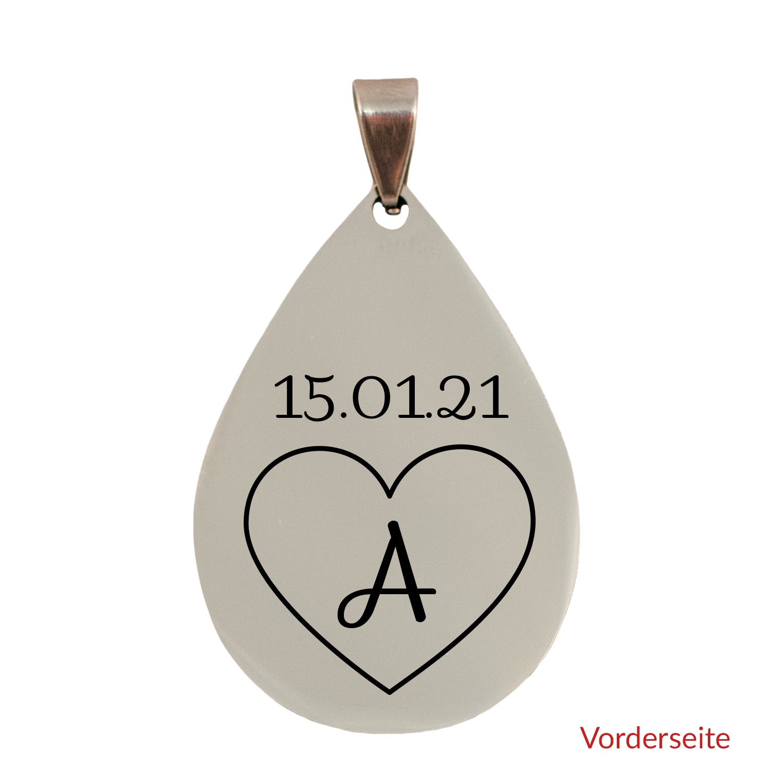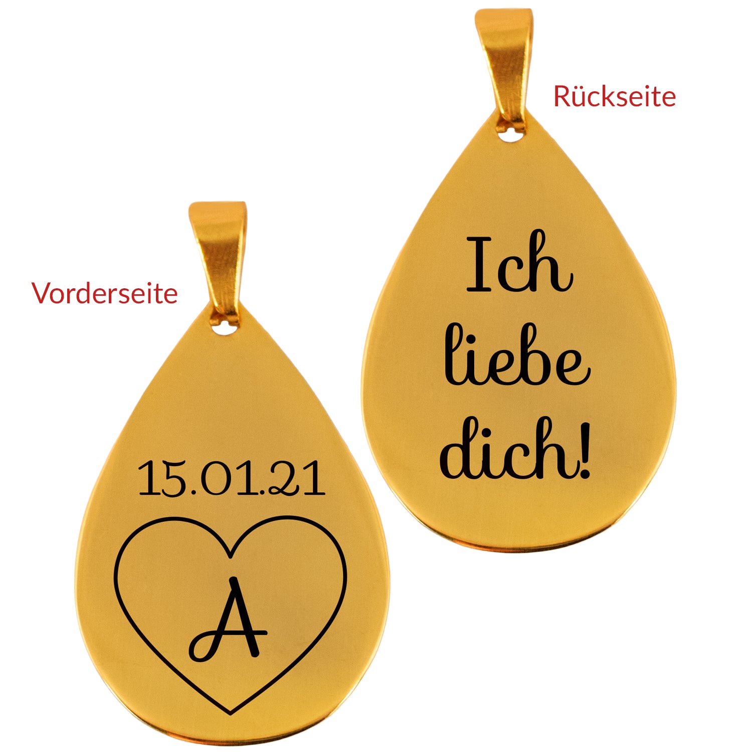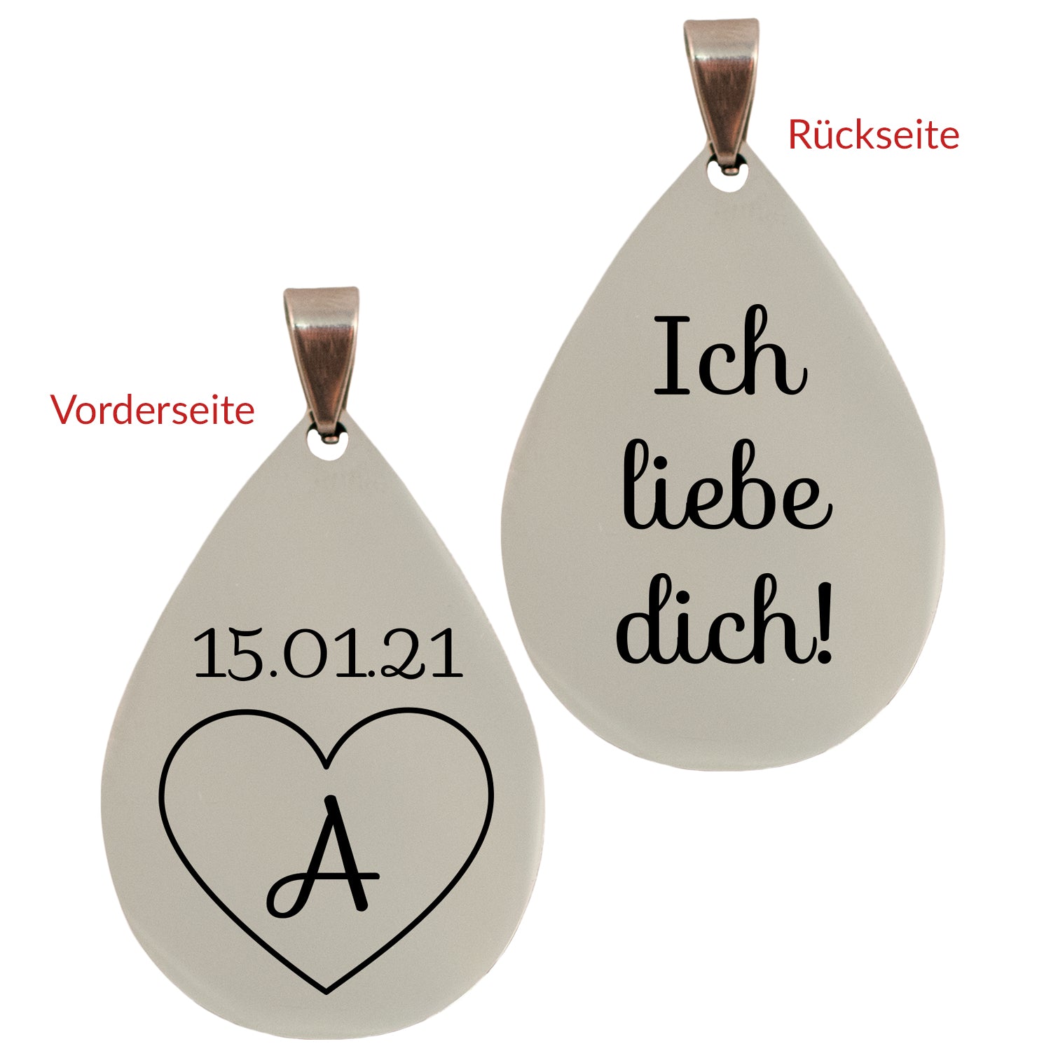 Der Anhänger hat eine Größe von 4 x 2,7 cm und ist wahlweise in Silber oder Gold bestellbar. Geliefert wird der Anhänger ohne Kette! Er ist in Form eines Tropfens gehalten und wirkt schlicht, aber auch besonders edel. Der Anhänger lässt sich mit jedem Outfit wunderbar kombinieren, egal ob lässig oder elegant. Als besonderes Highlight wird die Vorderseite des Kettenanhängers mit einem Herz graviert, welches im Inneren Deine Wunschinitiale trägt. Oberhalb des Herzens gravieren wird Dein Wunschdatum. Die Rückseite des Anhängers wird mit dem Schriftzug "Ich liebe Dich" graviert. Verzaubere Dein Herzblatt mit dieser besonders schönen Liebeserklärung, welche sie oder er stets bei sich tragen wird.