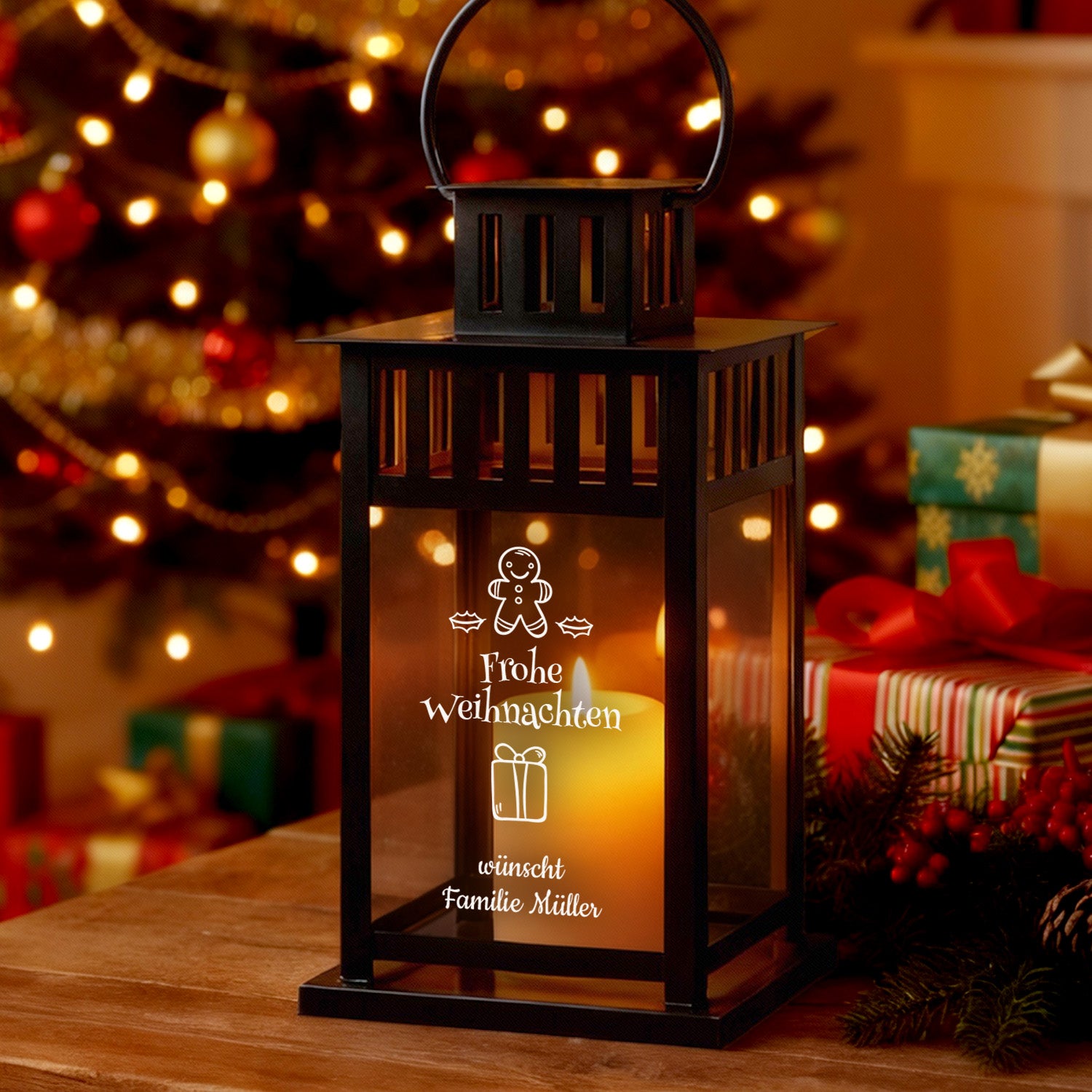 Doch das besondere Highlight ist die personalisierte Gravur: Wähle aus vier weihnachtlichen Motiven und veredle die Laterne mit einem Familiennamen oder Deinem eigenen Wunschtext. So wird jede Laterne zu einem unvergesslichen, persönlichen Weihnachtsgeschenk.