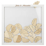 Der Holzrahmen in Weiß hat eine Größe von etwa 40,0 x 38,0 x 4,0 cm. Befüllt wird er mit kleinen Wolken aus Holz, die durch den Einwurfschlitz an der Oberseite in den Rahmen gelangen. 30 Wolken sind im Lieferumfang enthalten, sodass sich mindestens 30 Gäste in diesem Gästebuch eintragen können. Wir empfehlen den Eintrag mit Kugelschreiber vorzunehmen, damit die Schrift ganz sicher nicht verläuft. Auch eine Klappkarte zum Aufstellen mit einer Anleitung für Freunde und Verwandte wird mit dem Gästebuch geliefert. Je nach Anlass verewigen wir die zwei Namen des Brautpaares oder den Namen des Täuflings sowie dem Taufdatum auf dem Rahmen. So erhält das Geschenk eine ganz persönliche Note.