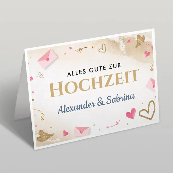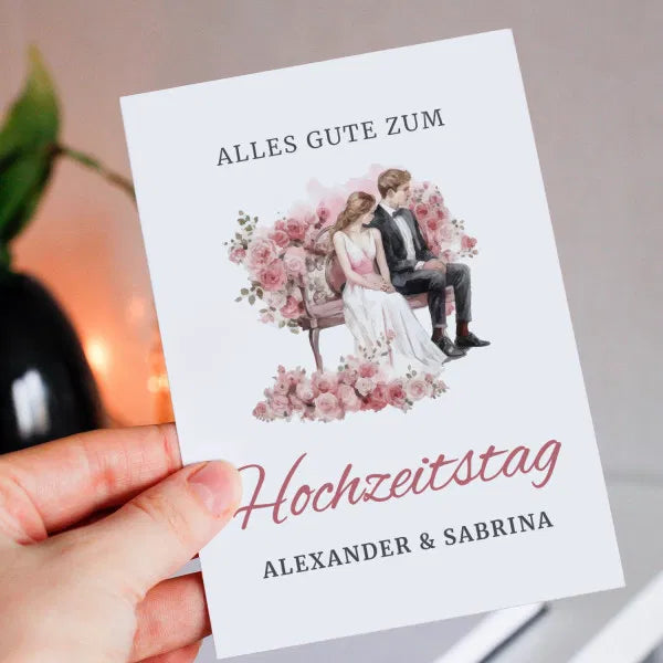 - Individuelle Personalisierung: Jede Karte kann optional mit den Namen des Brautpaares personalisiert werden, um ihnen eine einzigartige Botschaft zu übermitteln.