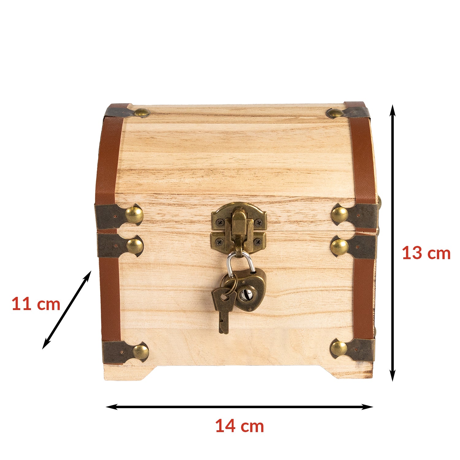 - Hochwertige Materialien: Die Schatztruhe besteht aus hochwertigem Holz und Metall mit antik wirkenden Kunstlederbeschlägen, die ihr einen nostalgischen und eleganten Charme verleihen.