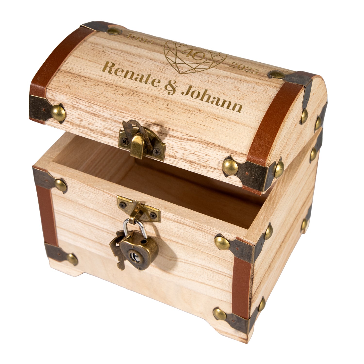 Bestelle jetzt unsere einzigartige Schatztruhe zur Rubinhochzeit und verschenke ein Stück Glück und Erinnerungen. Diese Truhe wird das Paar begeistern und ihnen unvergessliche Momente bescheren. Feiere mit ihnen die Liebe und das Ehejubiläum auf ganz besondere Weise. Sei Teil ihrer Geschichte und bringe mit diesem persönlichen und individuellen Geschenk Freude in ihr Leben.