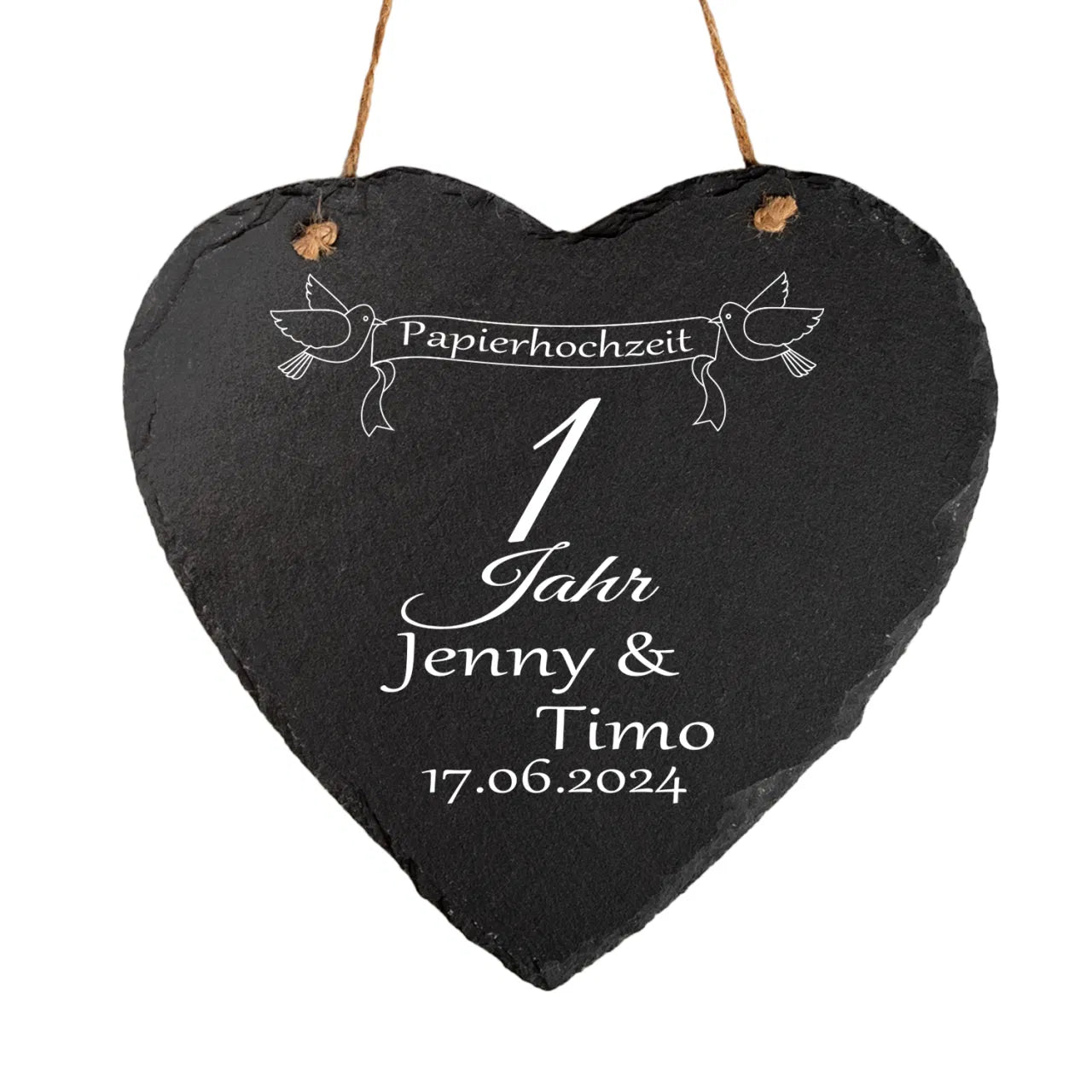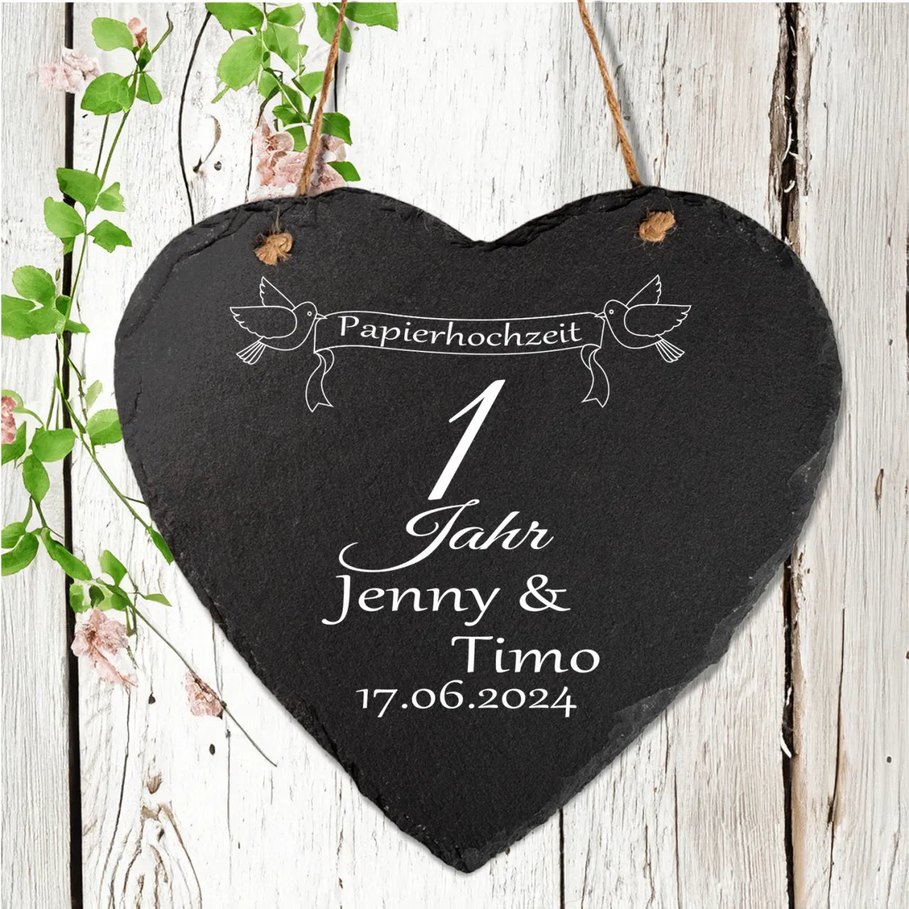 Die Papierhochzeit markiert das erste bedeutende Ehejubiläum – ein Jahr voller gemeinsamer Erinnerungen, Erlebnisse und Liebe. Unser personalisiertes Schieferherz ist das perfekte Geschenk, um diesen besonderen Anlass stilvoll zu feiern. Gefertigt aus natürlichem Schiefer, strahlt es rustikale Eleganz aus und wird durch das filigrane Motiv eines Taubenpaars mit dem Schriftzug „1 Jahr“ kunstvoll veredelt. Ergänzt mit euren beiden Wunschnamen und dem individuellen Datum, entsteht ein einzigartiges Erinnerungsstück, das eure Verbundenheit für immer festhält. Durch das mitgelieferte Satinband lässt sich das Herz dekorativ aufhängen – sei es im Wohnzimmer, Schlafzimmer oder an einem anderen Lieblingsplatz.