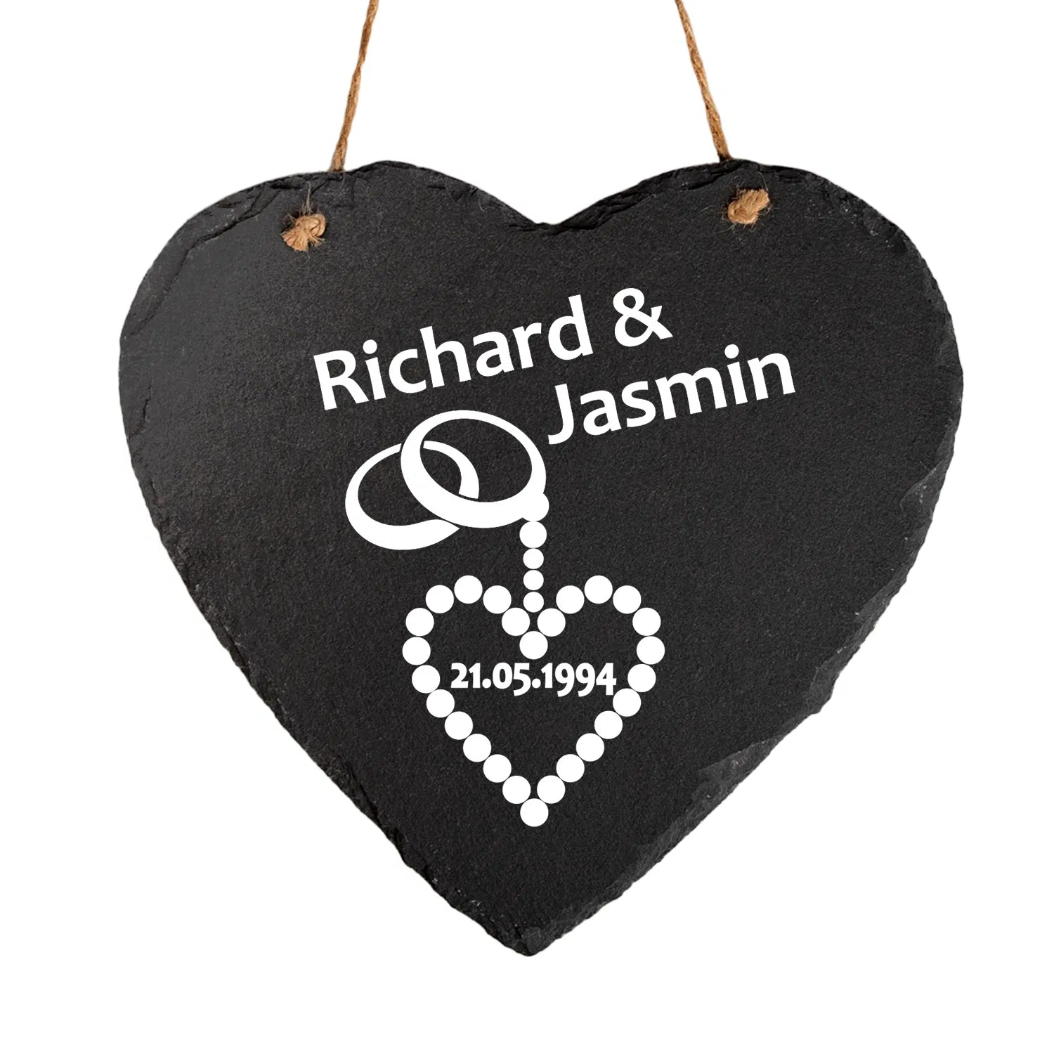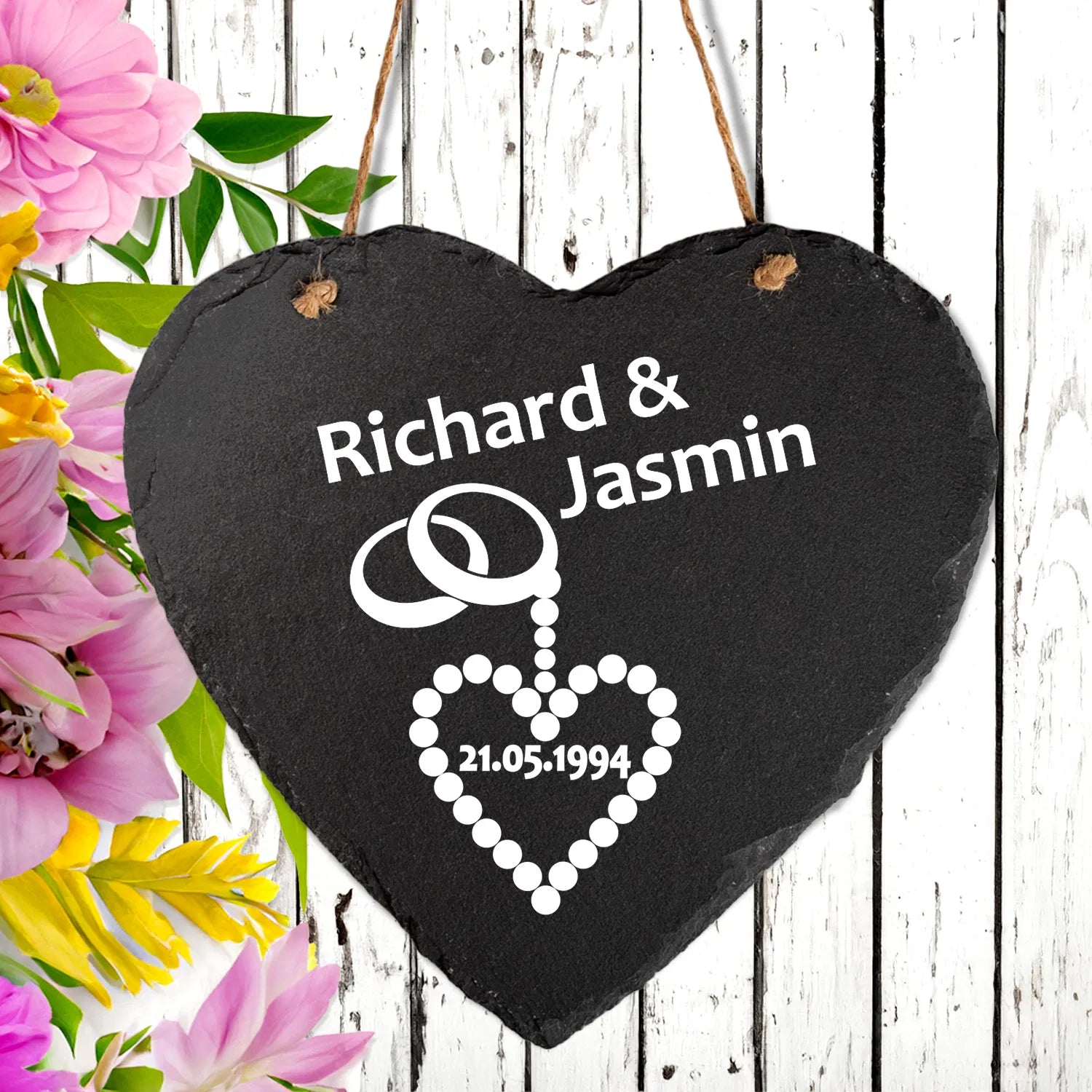 - Personalisierung: Lasse das Schieferherz mit Namen des Paares und einem Wunschdatum bedrucken.