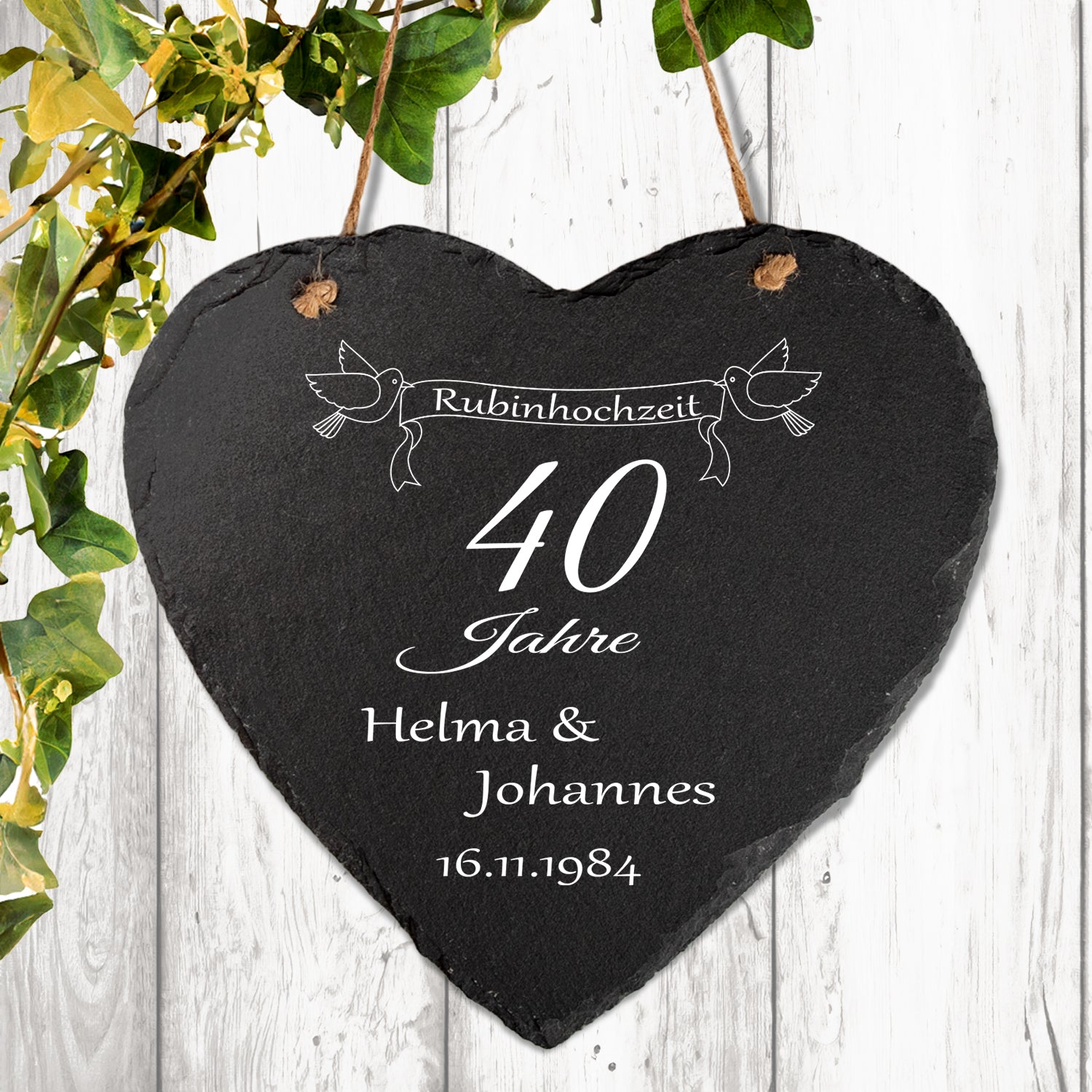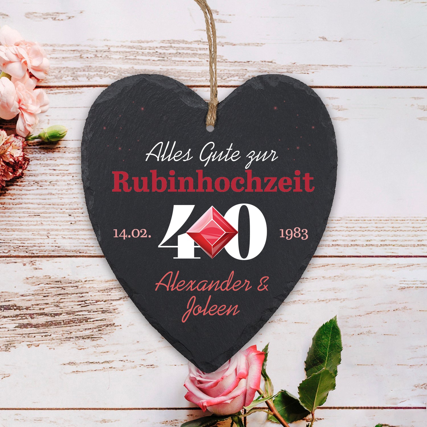 Überrasche zu einem freudigen Ereignis, wie dem 40-jährigen Ehejubiläum, mit einem ganz besonderen Erinnerungsstück und wundervollen Wohnaccessoire. Überreiche mit dem Schieferherz - Rubinhochzeit mit Personalisierung ein persönliches Geschenk, das sich durch seinen stilvollen Charme auszeichnet.