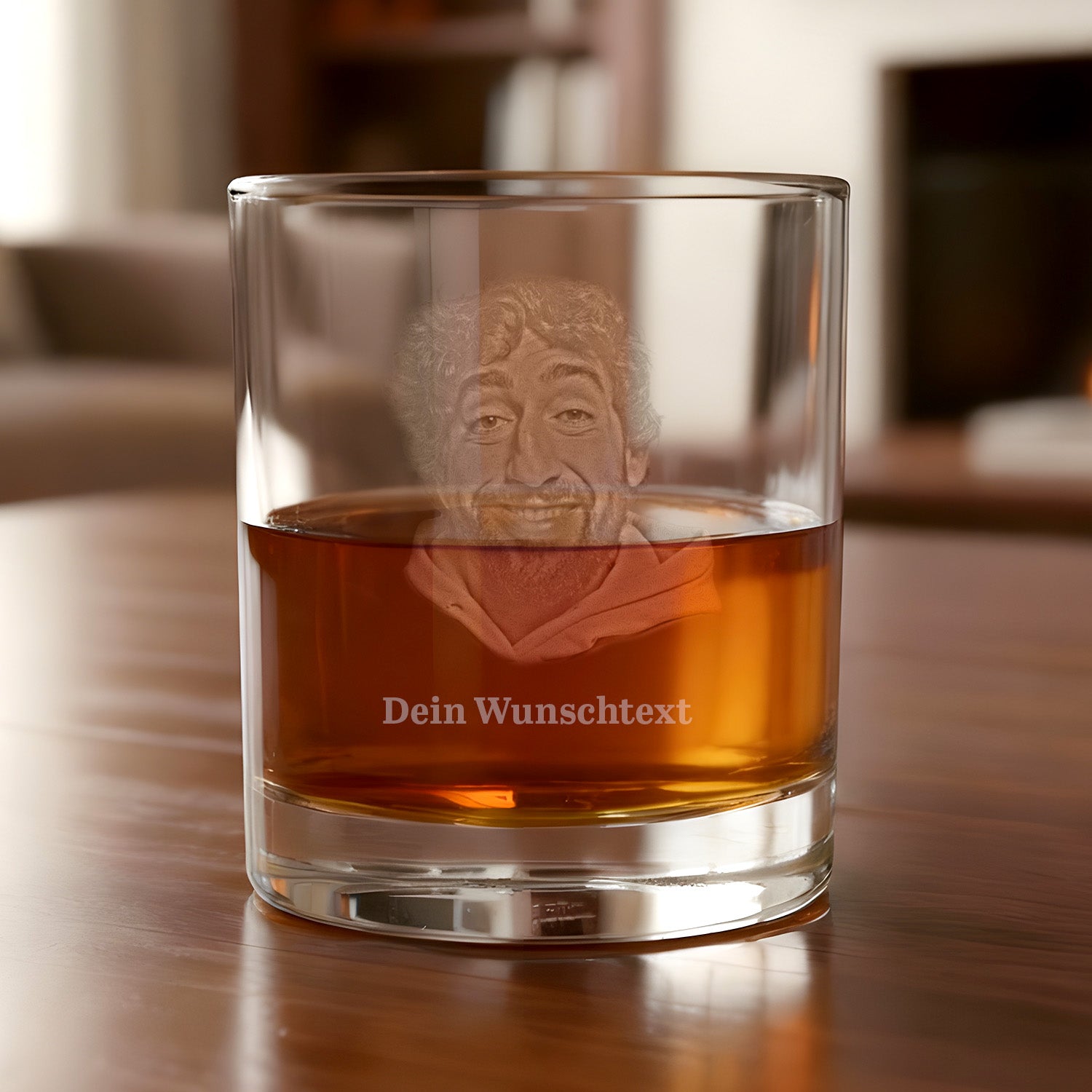 Dieses edle Whiskyglas wird mit Deinem Wunschfoto und einem individuellen Text (bis 24 Zeichen) graviert. So entsteht ein echtes Unikat – perfekt für Genießer, die Stil und Persönlichkeit schätzen.