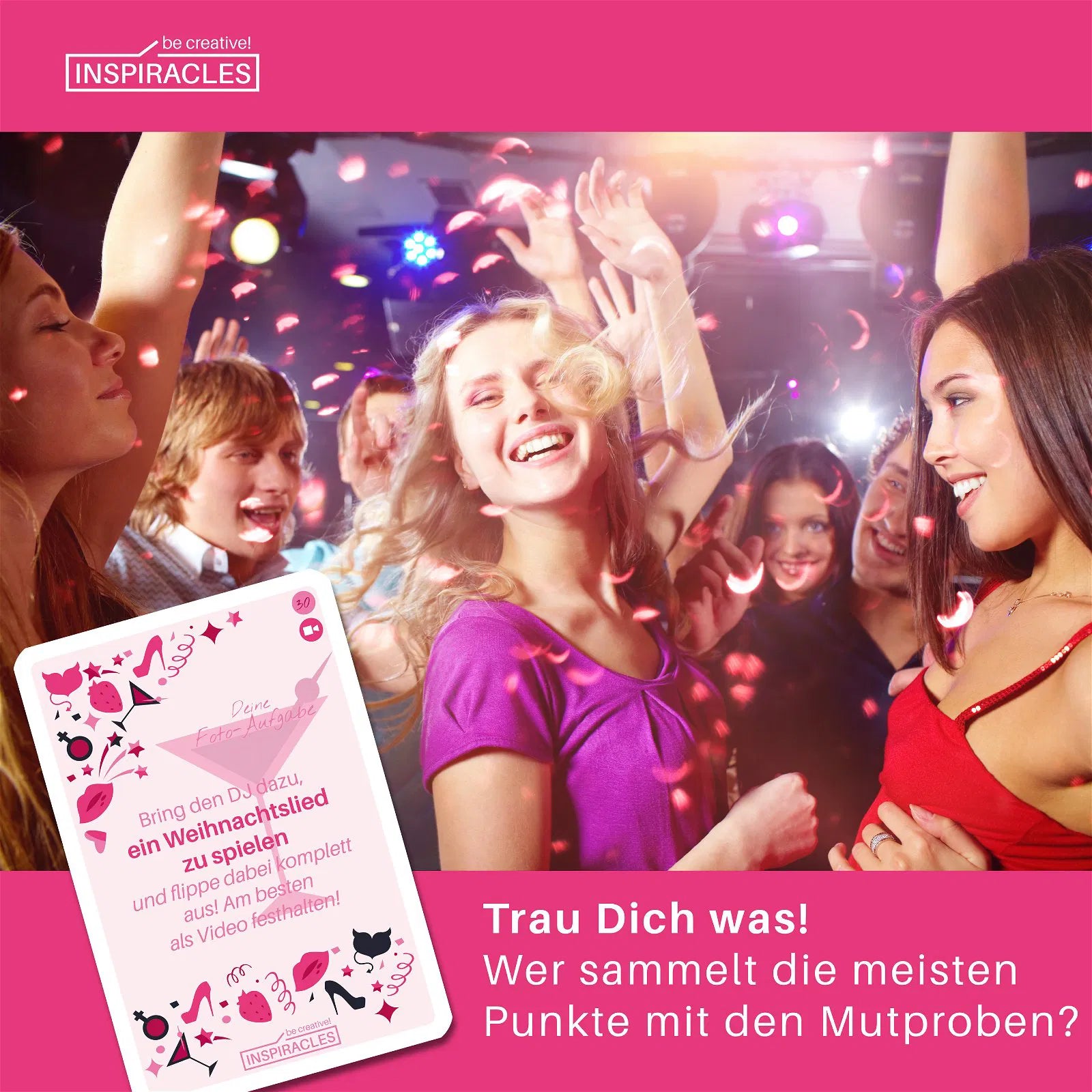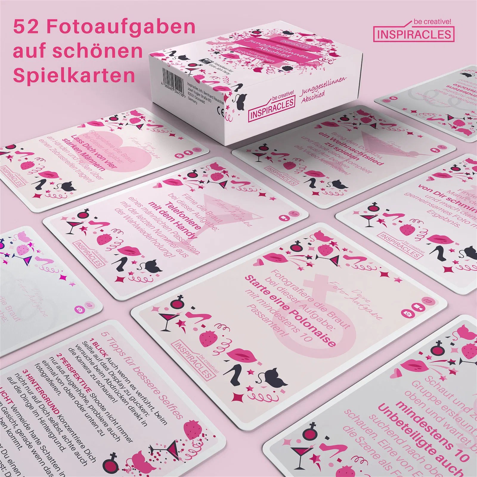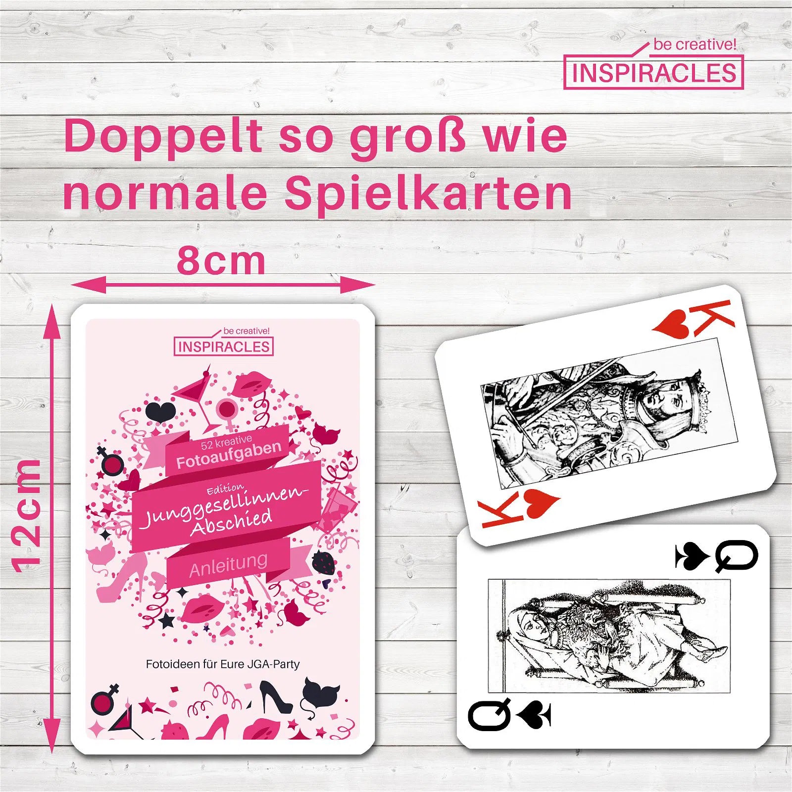Deine beste Freundin wird demnächst heiraten? Dann ist es langsam an der Zeit, ihren Junggesellinnenabschied zu feiern! Die Planung eines JGAs geht mit großer Verantwortung einher, schließlich möchte man, dass dieses einmalige Erlebnis unvergesslich wird. Steht erstmal fest, wohin der Polter-Ausflug hingehen soll, geht es an den Feinschliff: Spiele, Aufgaben und passende Accessoires müssen her. Der Peinlichkeitsfaktor darf dabei natürlich nicht fehlen. Auf einen Stuhl steigen und eine Flasche versteigern, den DJ dazu bringen, ein Weihnachtslied zu spielen oder mit dem Handy eines Fremden telefonieren. Das Kartenspiel zum Junggesellinnenabschied hält 52 witzige Aufgaben bereit, die es in sich haben. Doch mit Humor und dem Hoffentlich-kennt-mich-hier-niemand-Gedanken lässt sich jede Herausforderung lösen. Um alles für die Ewigkeit festzuhalten, befinden sich zusätzlich Foto- oder Videoaufgaben auf den Karten. Auf der Kartenrückseite findet ihr zusätzlich Fototipps für den perfekten Schuss. Spaß steht hierbei selbstverständlich an erster Stelle.