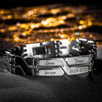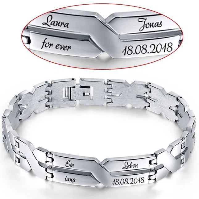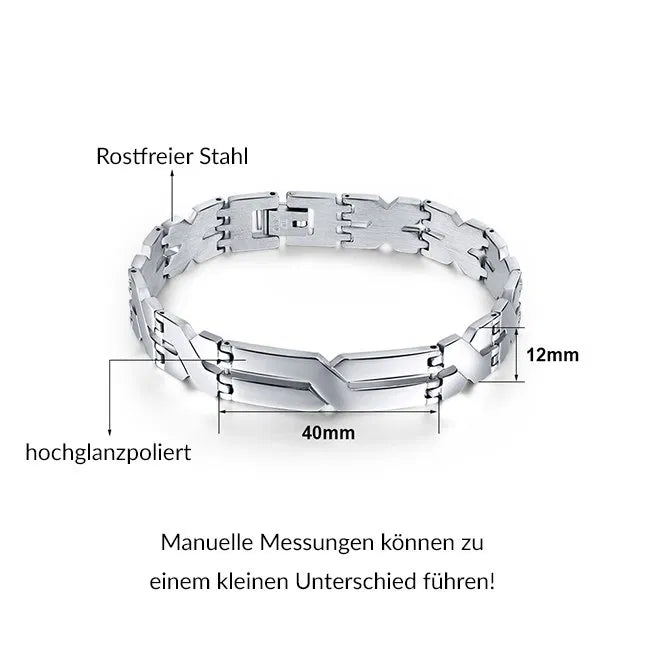 Das edle Armband aus Edelstahl ist bei uns in 3 verschiedenen Längen erhältlich. Es hat eine Breite von 1,2 cm. Kleiner Tipp: Wenn Du unsicher bist, welche Länge für den Beschenkten passend ist, wähle eine längere Variante. Das Armband kann beim Juwelier oder Uhrmacher jederzeit gekürzt werden. Für Deine persönliche Botschaft stehen Dir insgesamt vier Felder zur Verfügung. Diese werden nach Deinen Wünschen mit je bis zu 12 Zeichen graviert. Hier kannst Du beispielsweise ein bedeutsames Datum, Namen oder einen kurzen Spruch verewigen. Dadurch wird dieses romantische Geschenk zu einem Unikat!