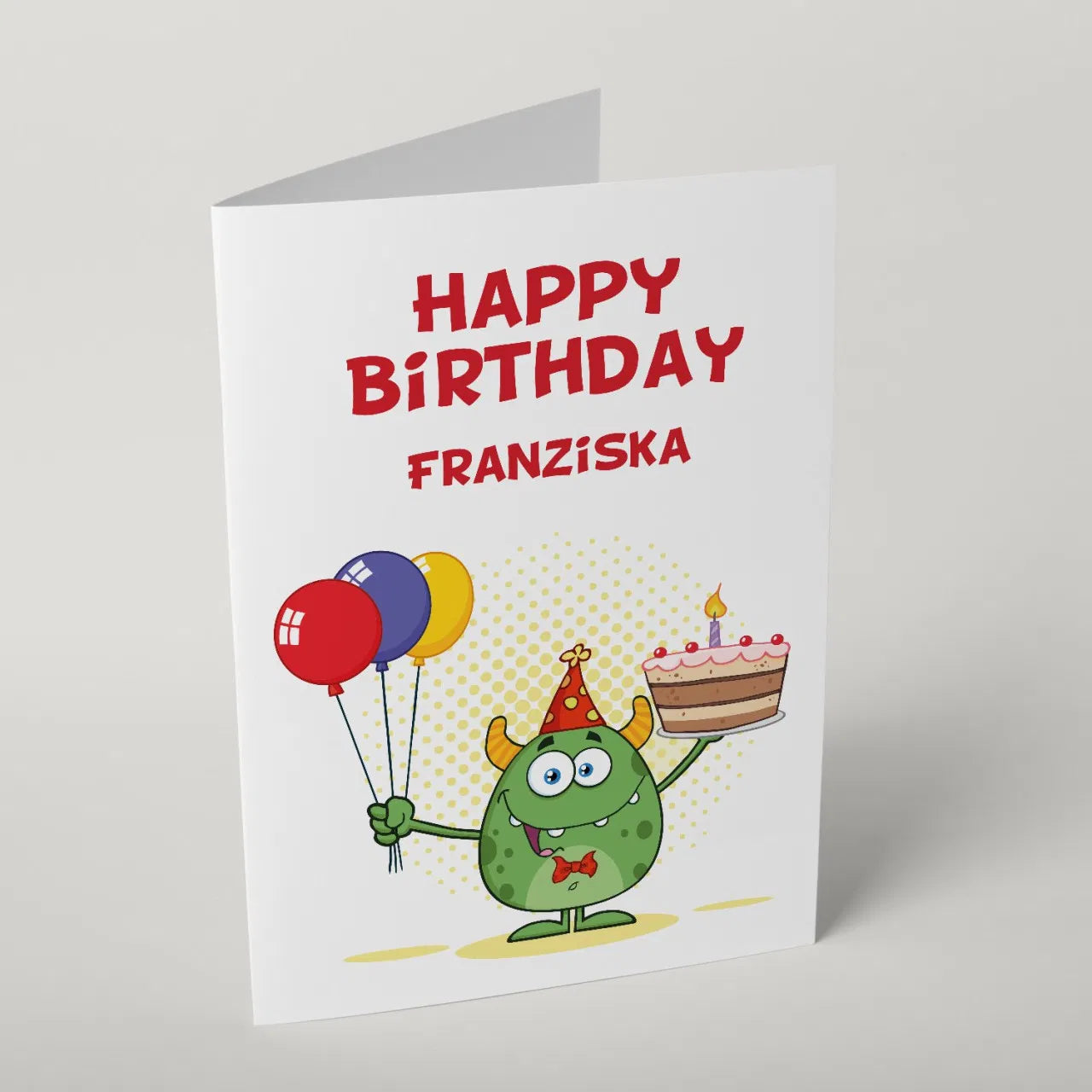 Unser liebenswertes Monster bringt nicht nur Geschenke, sondern auch eine riesige Portion gute Laune mit. Die Luftballons, der Kuchen und die fröhlichen Farben verbreiten sofort Geburtstagsstimmung. Ob für die beste Freundin, den coolsten Kumpel oder die liebe Oma - mit dem Schriftzug "Happy Birthday" und dem optionalen Wunschnamen wird diese Karte zu einem ganz persönlichen Geschenk. Und das Beste? Die Innenseite ist bewusst leer, damit Du Deine ganz persönlichen Glückwünsche hinzufügen kannst. Diese Klappkarte hat eine Größe von 10,5 x 14,8 cm und ist aus hochwertigem Material gefertigt, das Deinen Geburtstagsgruß lange bewahrt.